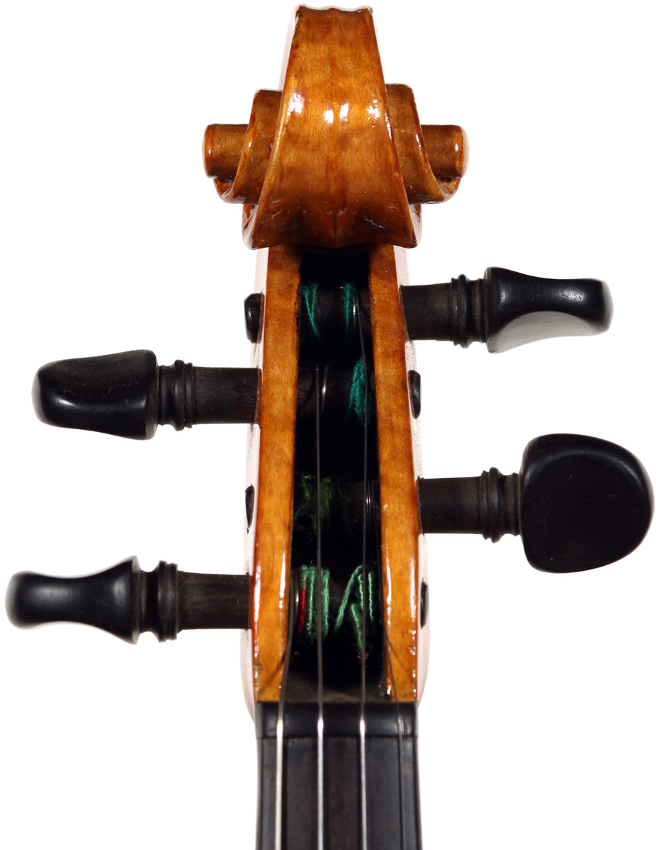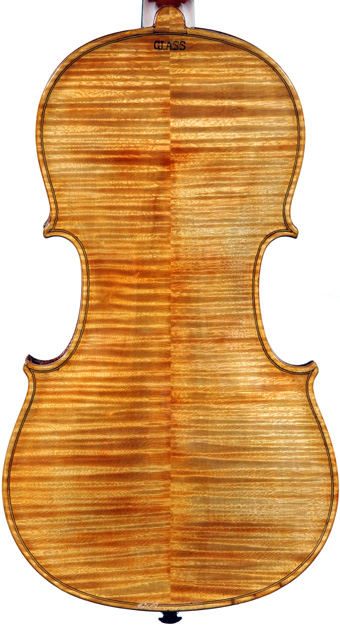 The origin of this violin is quite straight-forward. It is stamped GLASS on the back just below the neck button and is labelled as being a Stradivari copy by the firm of Friederich August Glass. This clearly establishes its German trade origin.