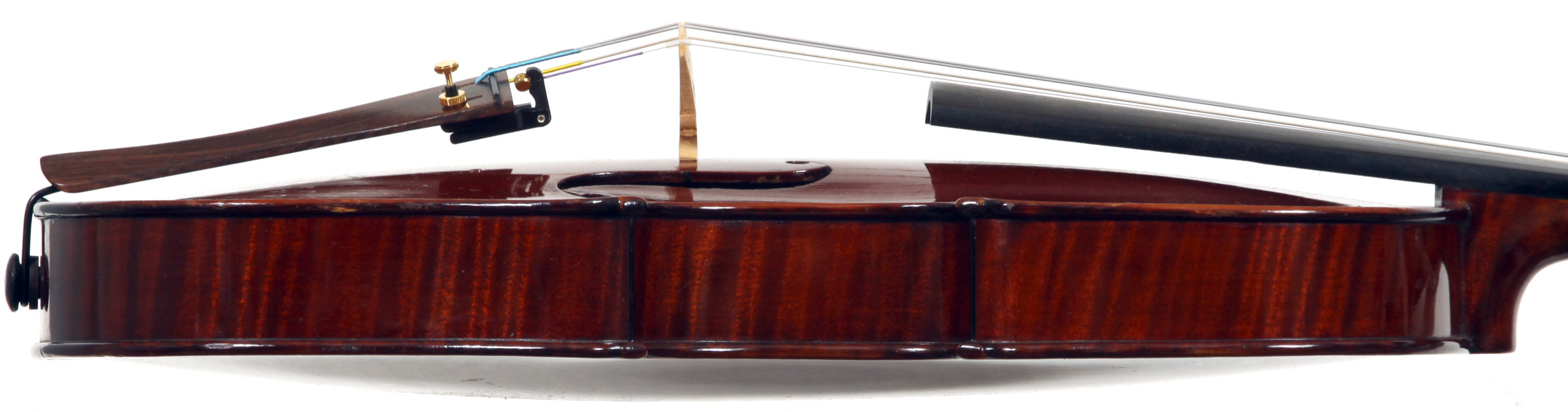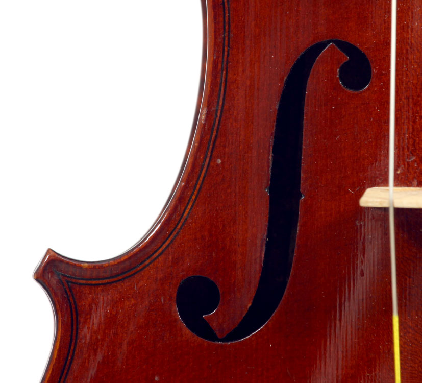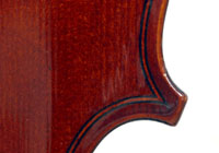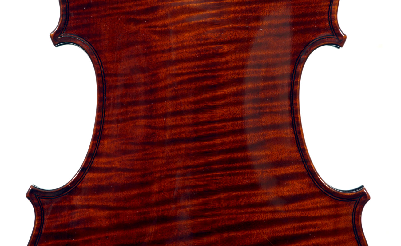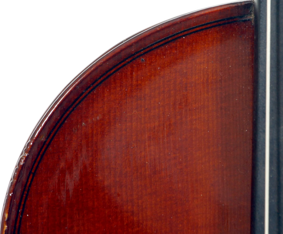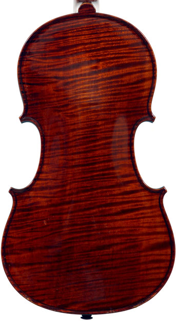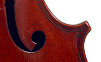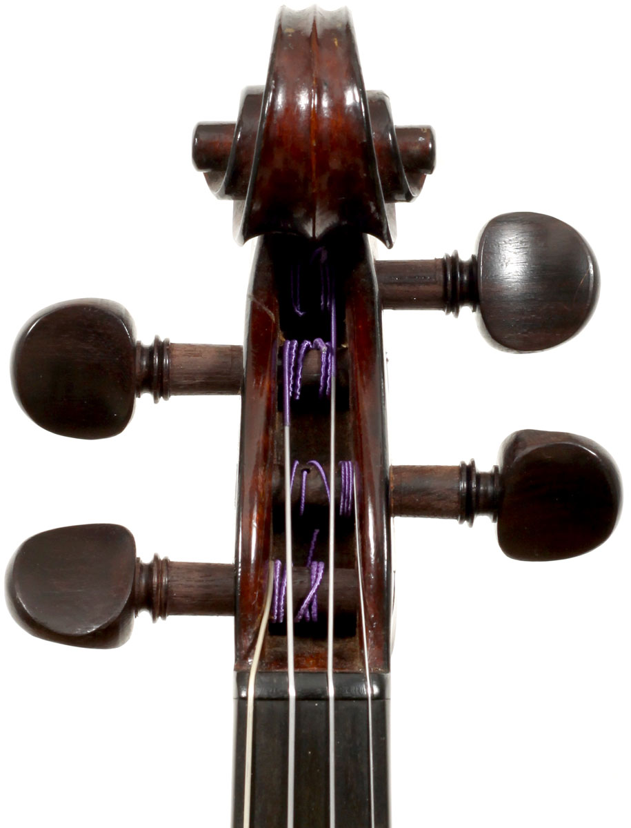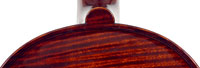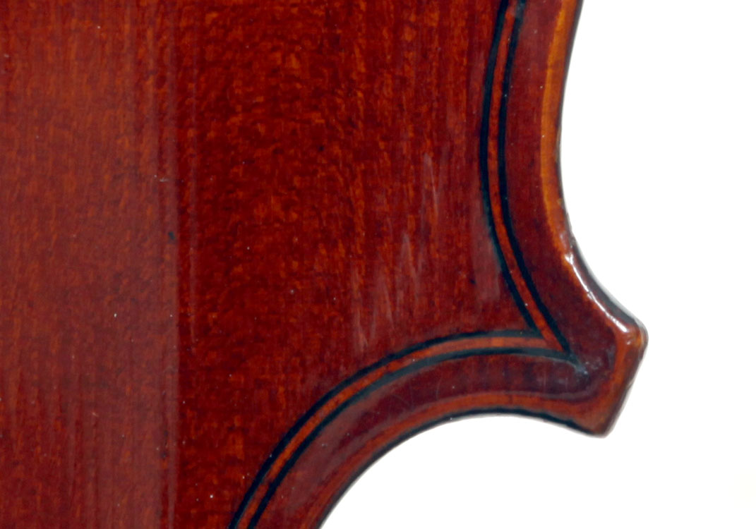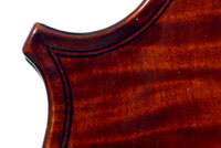 This violin represents the very best one could hope to find from this studio - an unusually beautiful one-piece back, well-flamed of medium curl maple. The sides, neck and scroll appear to be of the same wood, the sides being equally well-flamed. The scroll and Fs show a steady hand with attention to detail, as do the purfling and the cornerwork - very good throughout. Varnish is dark red-brown - nice on the eye, highly transparent and complimenting the beautiful choice of materials very well.