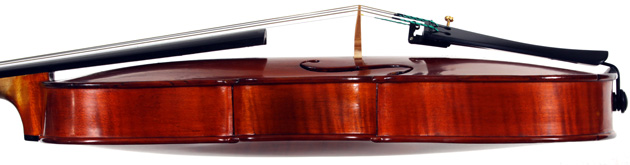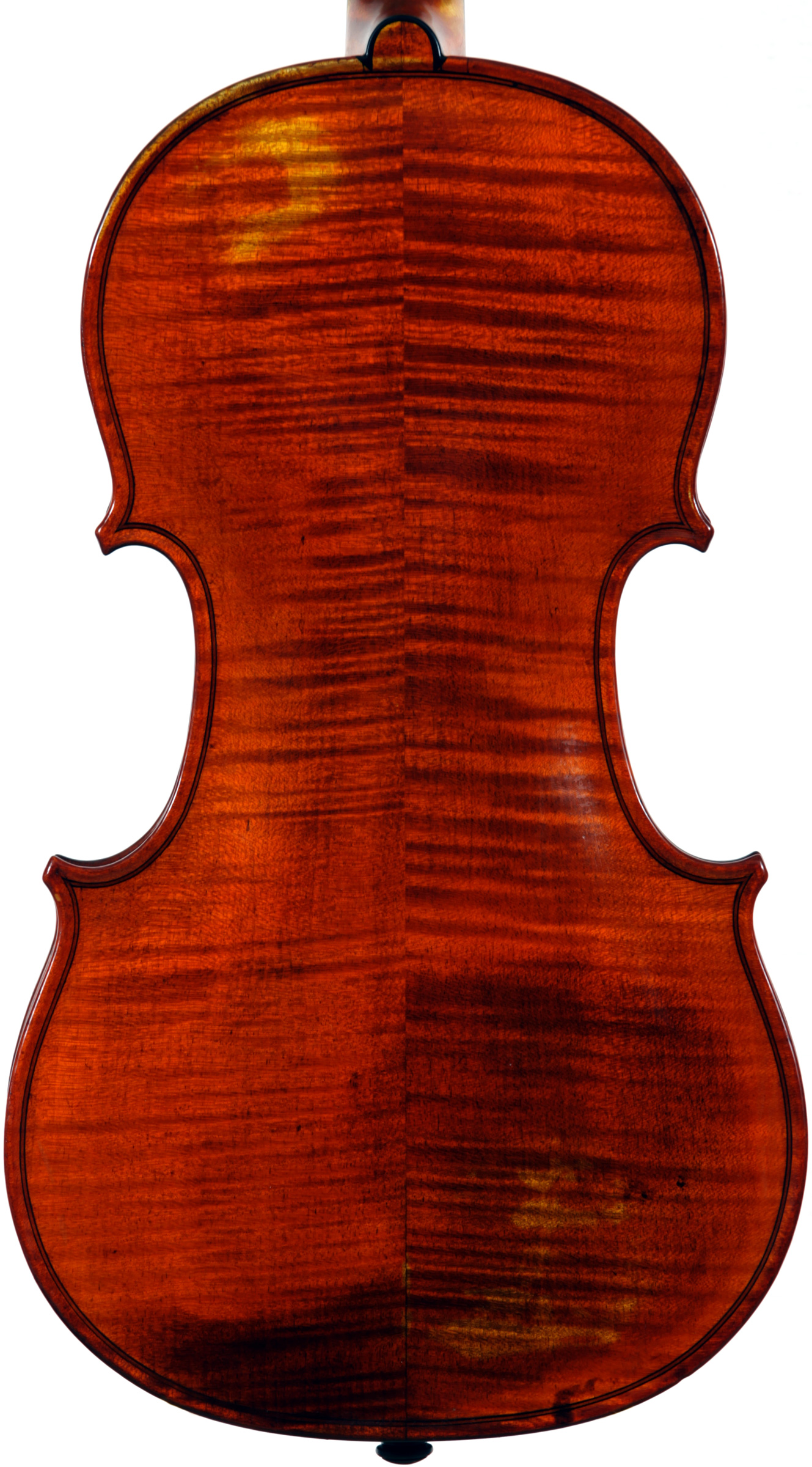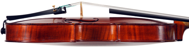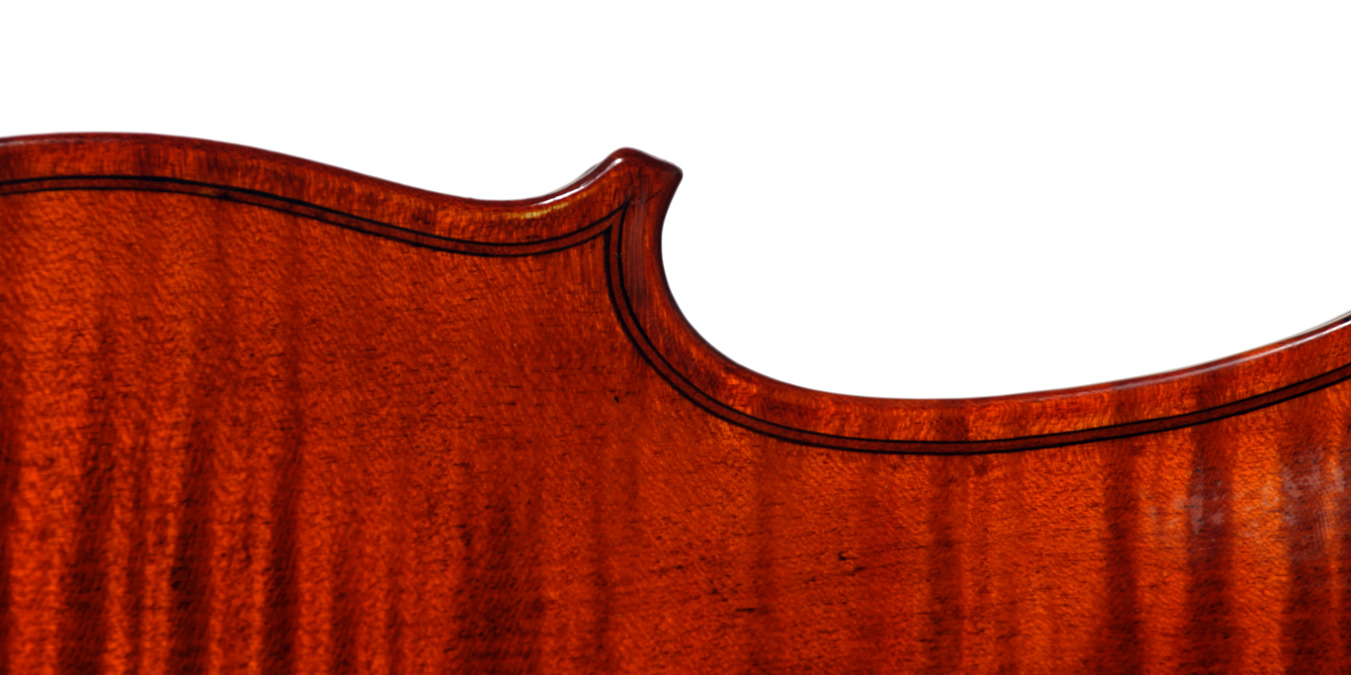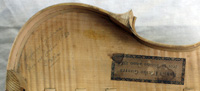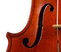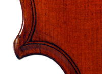 This violin shows Guerra's mastery in edgework with virtually perfect corners and mitres and finely crafted Fs. The purfling is absolutely superb and the scroll impeccable. The top is of medium grained tone spruce and the back, ribs and scroll of mildly flamed maple with a medium curl. This violin has been revarnished - see the notes below.