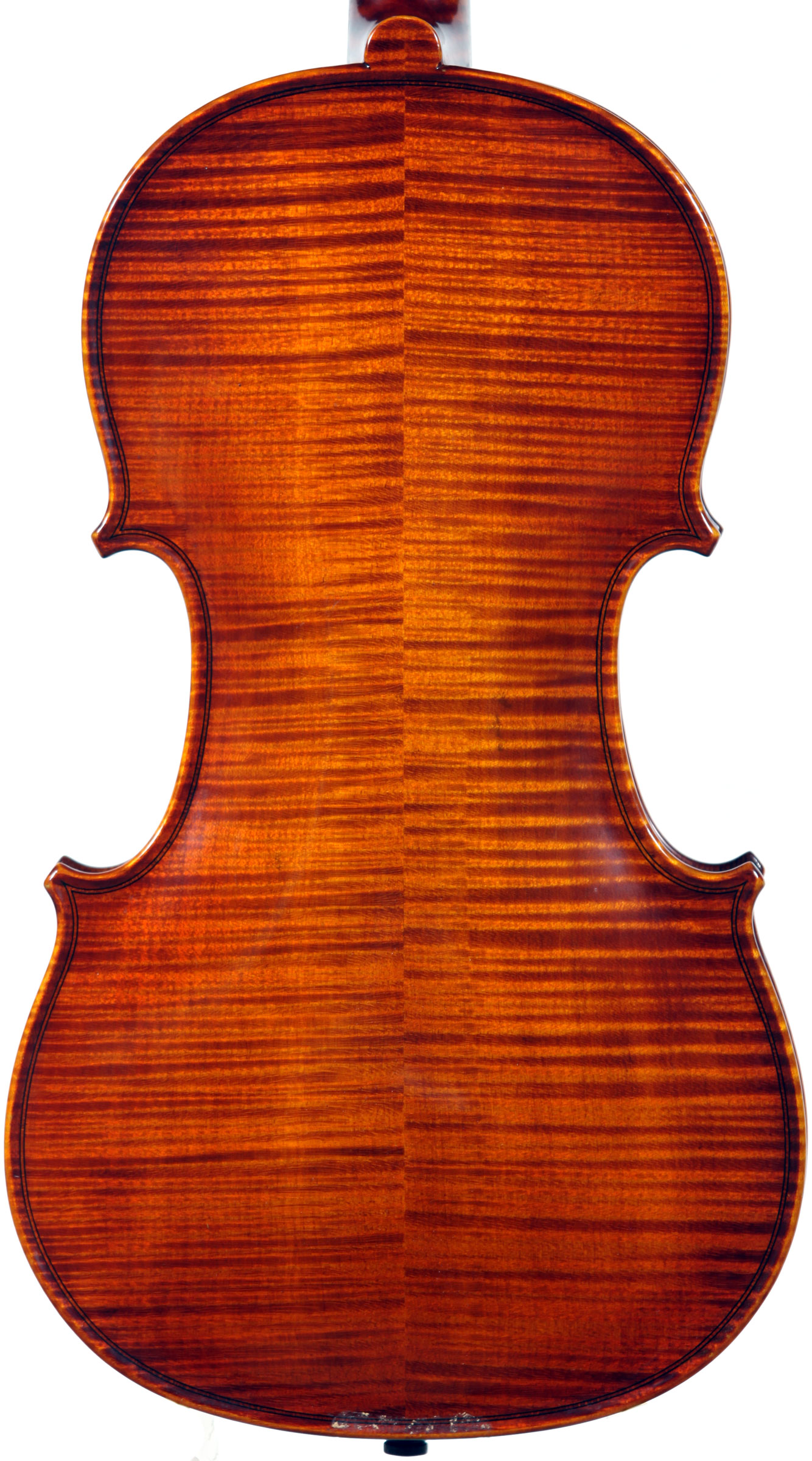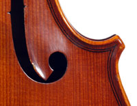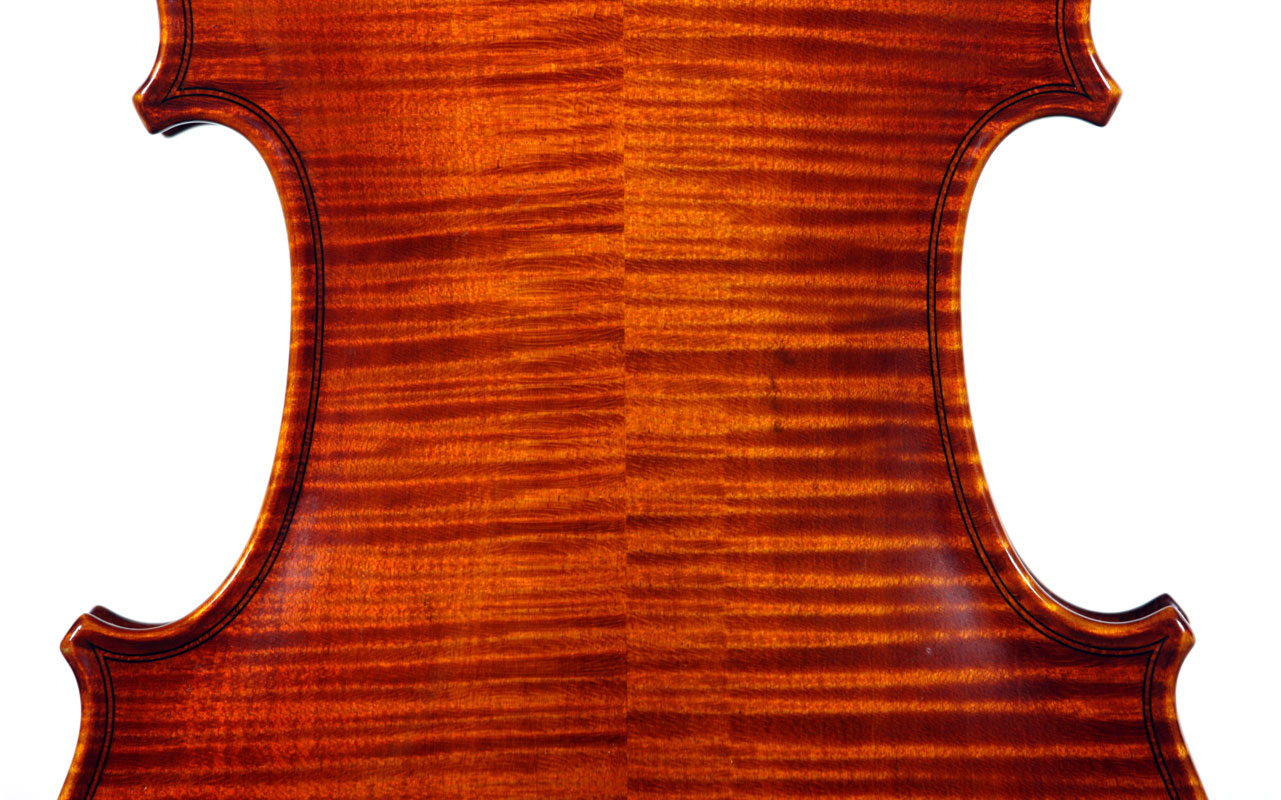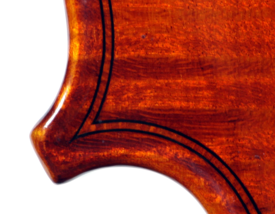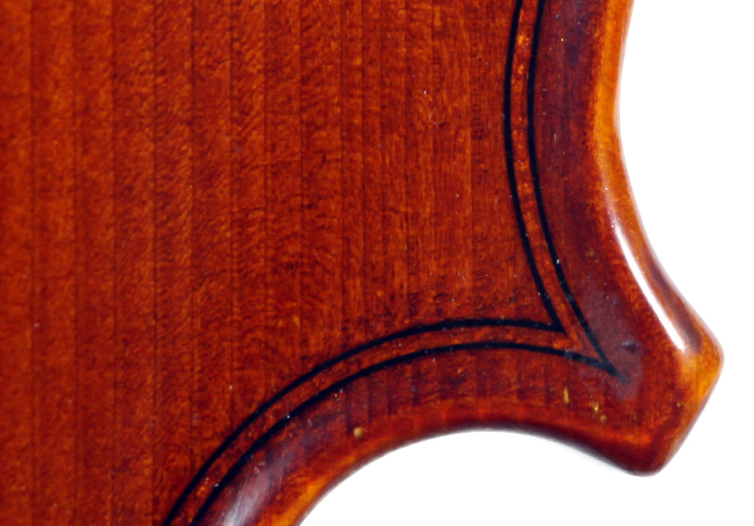 What strikes one immediately about this violin is the extremely attractive choice of materials that went into its making, along with the meticulous workmanship throughout in the unusual attention to detail, notably in the purfling, the cornerwork, the mitres, the nicely fluted wings in the Fs and a meticulously carved scroll with a deeply fluted curl and crisp edges - reminiscent of the Deganis and the Venetian school ; the maple used for the two-piece back, ribs, neck and scroll is extremely appealing by all standards with a distinctly flamed narrow curl running straight across the back, The top is of superb tone spruce of a very straight and even medium grain. The reddish-brown varnish is highly transparent and beautifully compliments the materials.