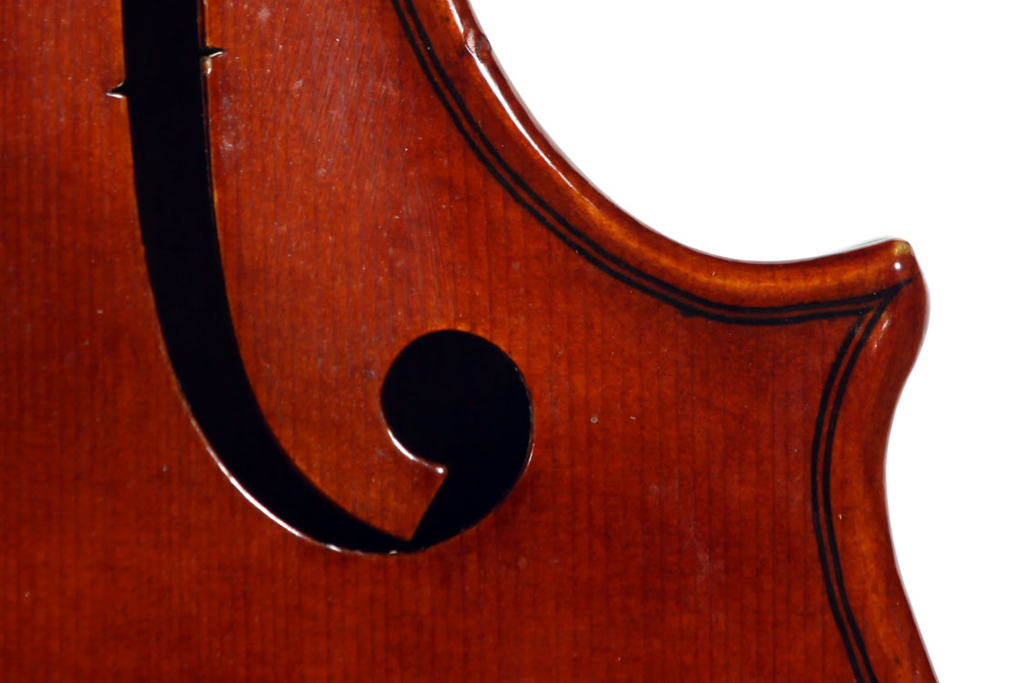 The one-piece back, ribs, neck and scroll are of mildly flamed maple with a narrow curl. The top is of excellent tone spruce with an even medium to narrow grain. The Fs show refinement and balance. The oil varnish is an attractive reddish brown.