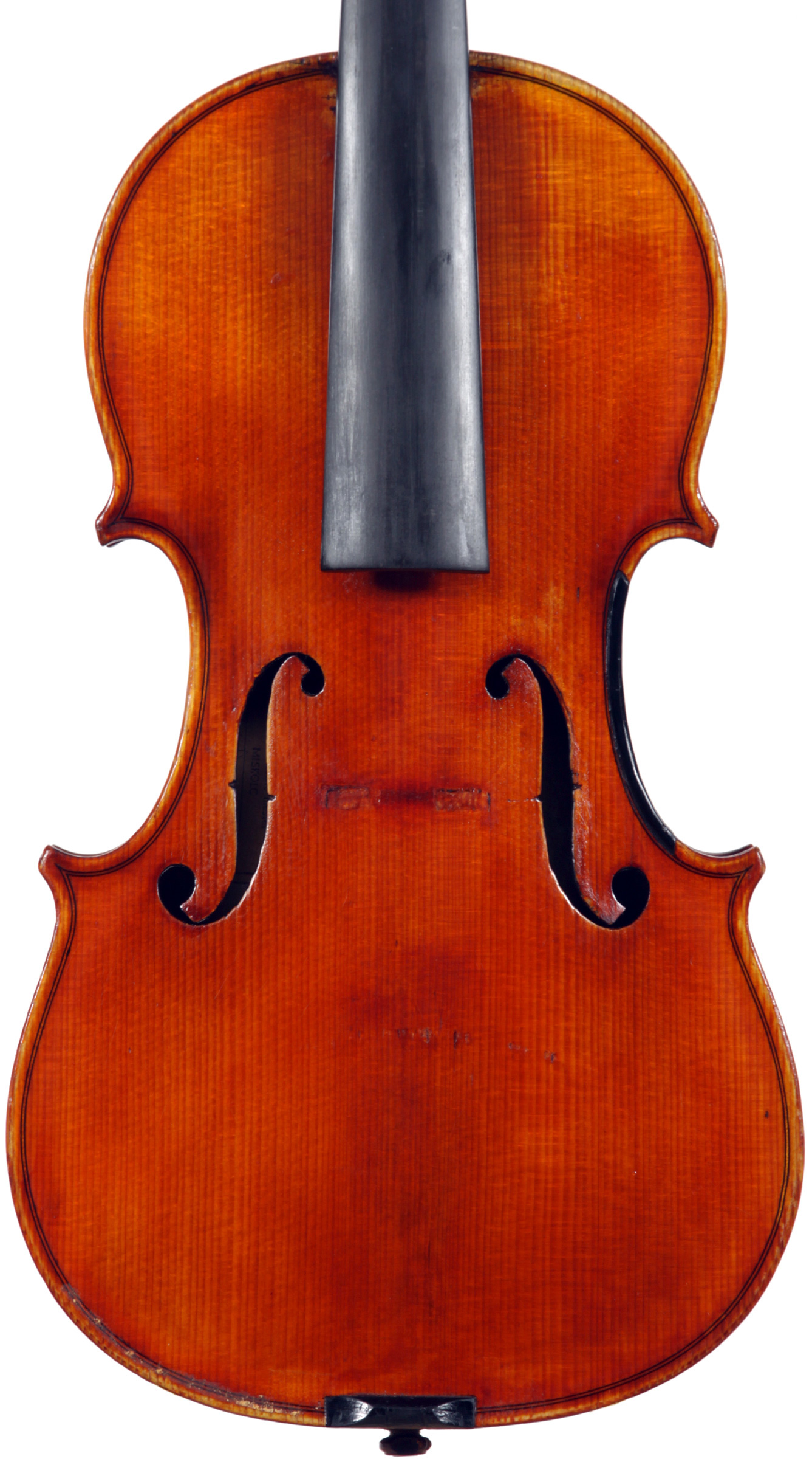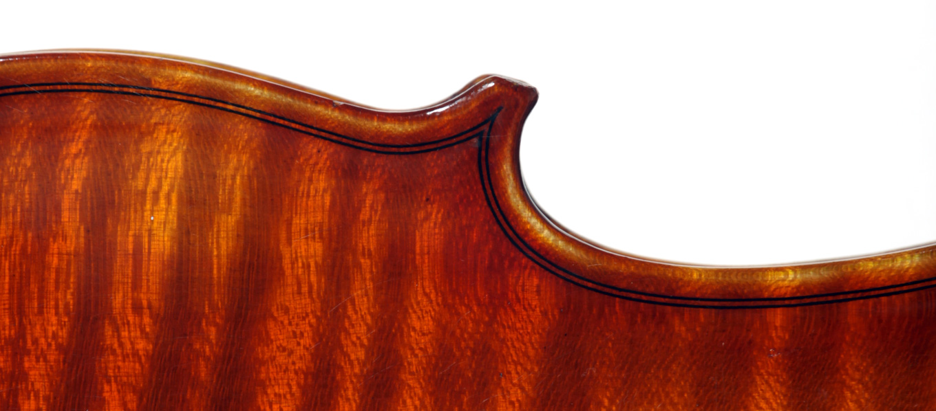 The two-piece back, ribs, neck and scroll are of good maple with a medium curl and distinct figure sloping down from the centre seam to the flanks. The top is of open-grained tone spruce. The oil varnish is an appealing orange-brown and the current fittings are of ebony.
