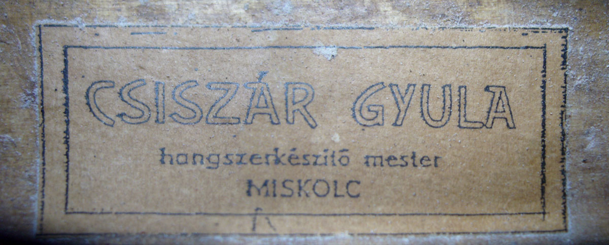 Gyula Csiszár's work as violin maker follows very closely in the tracks of his teacher, the great Hungarian maker, Sandor Elek (b. 1881). Born in Igrici in 1906, he set himself up in Miskolcz in 1926, where he remained until his death in 1970.