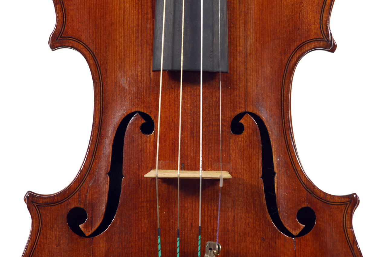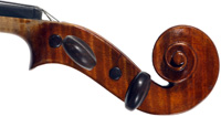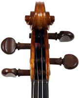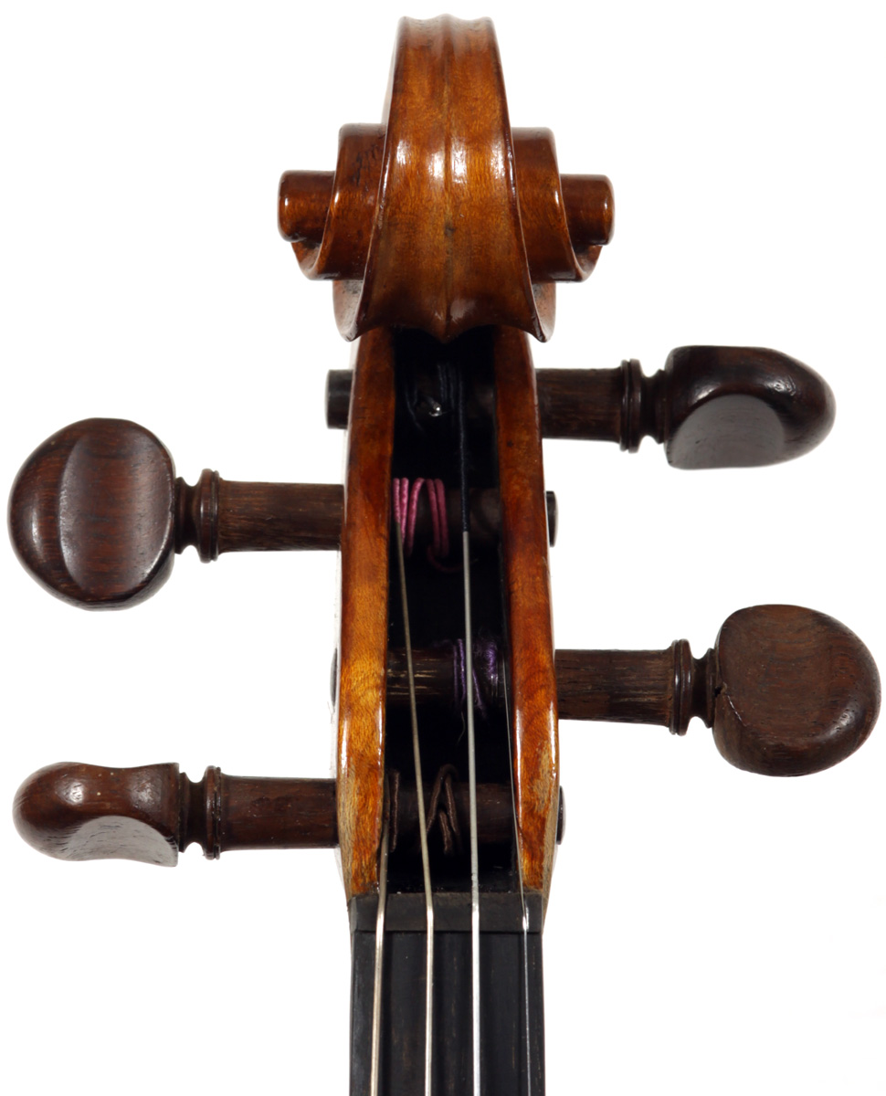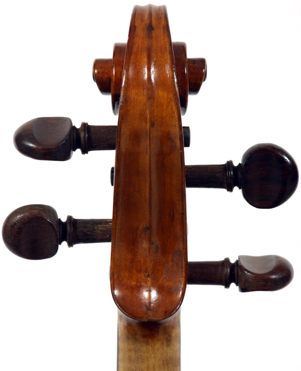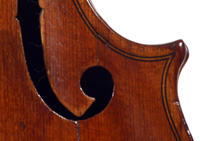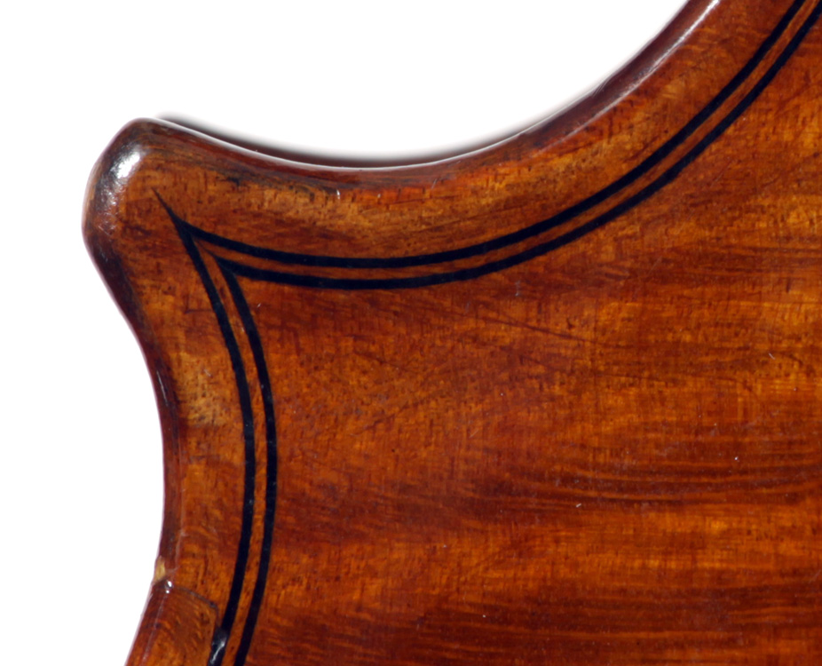 The scroll is impeccably balanced, refined and executed with unusual care and attention to detail. The Fs are crisp, tidy and balanced. The tracing of the purfling and execution of the corners and mitres are so good as to reflect the hand of a very experienced violin maker. And so, at this time, its origin remains unknown, but I would be greatly surprised if this is relegated to commercial work, which in my view it certainly is not. Since much of a violin's age is captured in its varnish and since this violin has been revarnished, it is difficult to assess its real age, but a calculated guess would put it at late- 19th century.