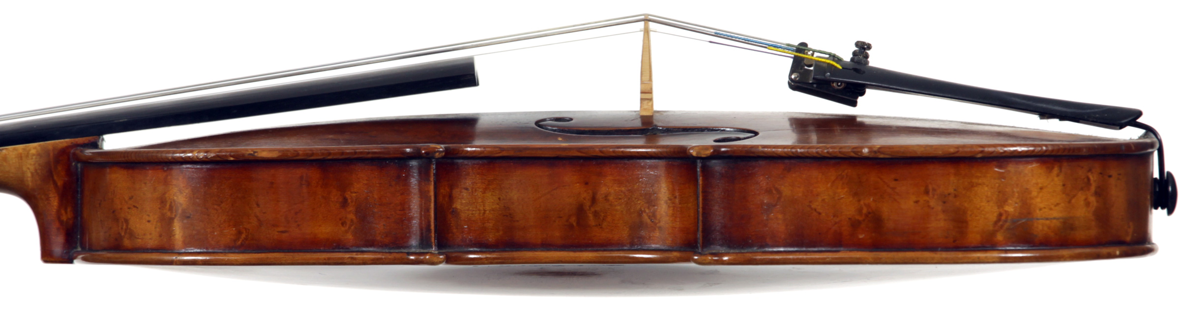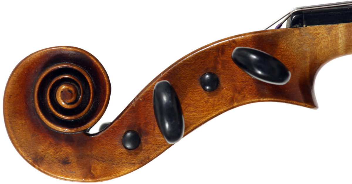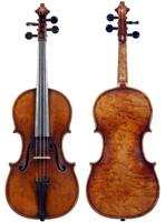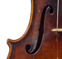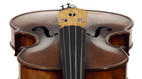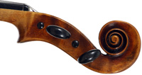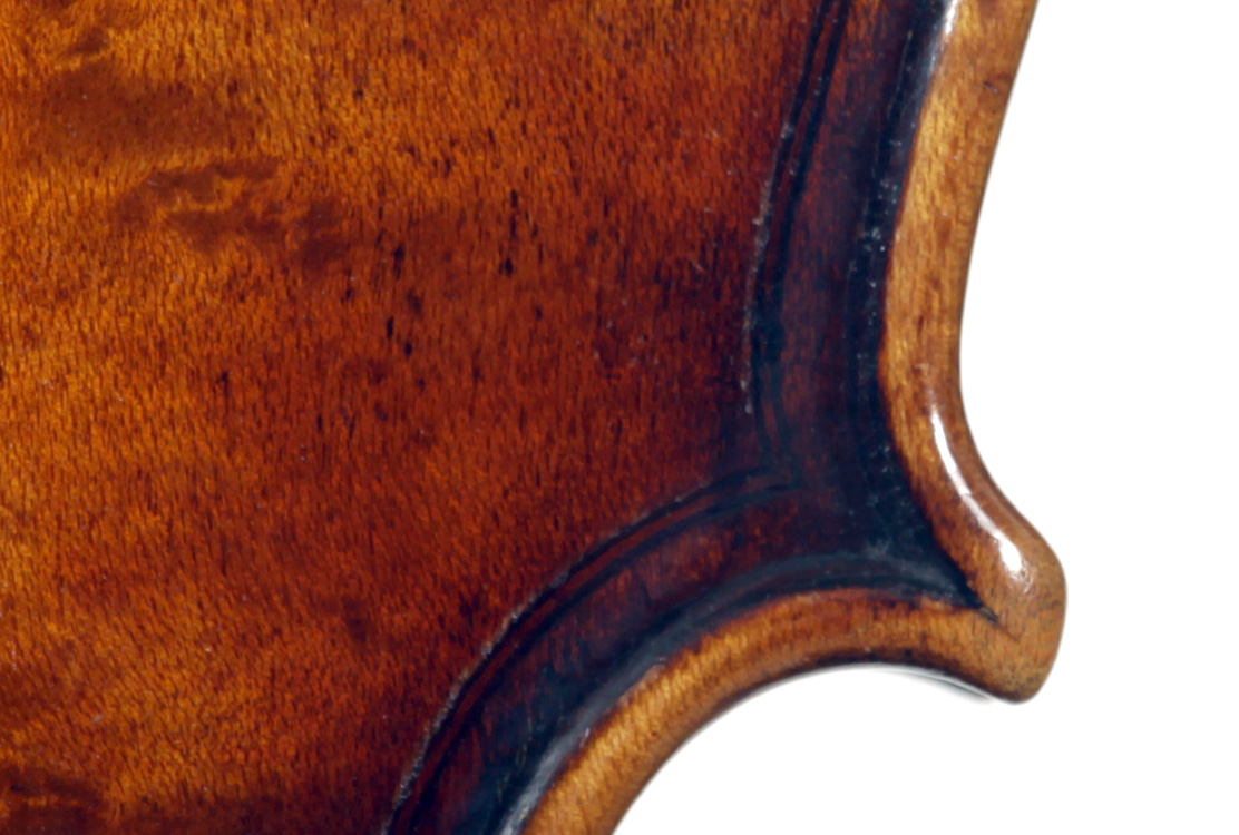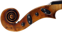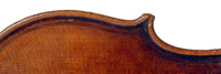 This violin follows the Maggini pattern - double purfling, a very long back length (36.9 cm in this case) and the additional curl in the scroll - a trademark of Maggini's idiosyncrasy. But then it deviates in that the Fs are certainly in the style of Guarneri. Workmanship is very tidy, notably in the scroll, the purfling and the cornerwork.