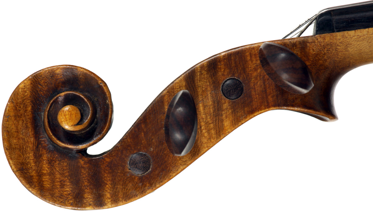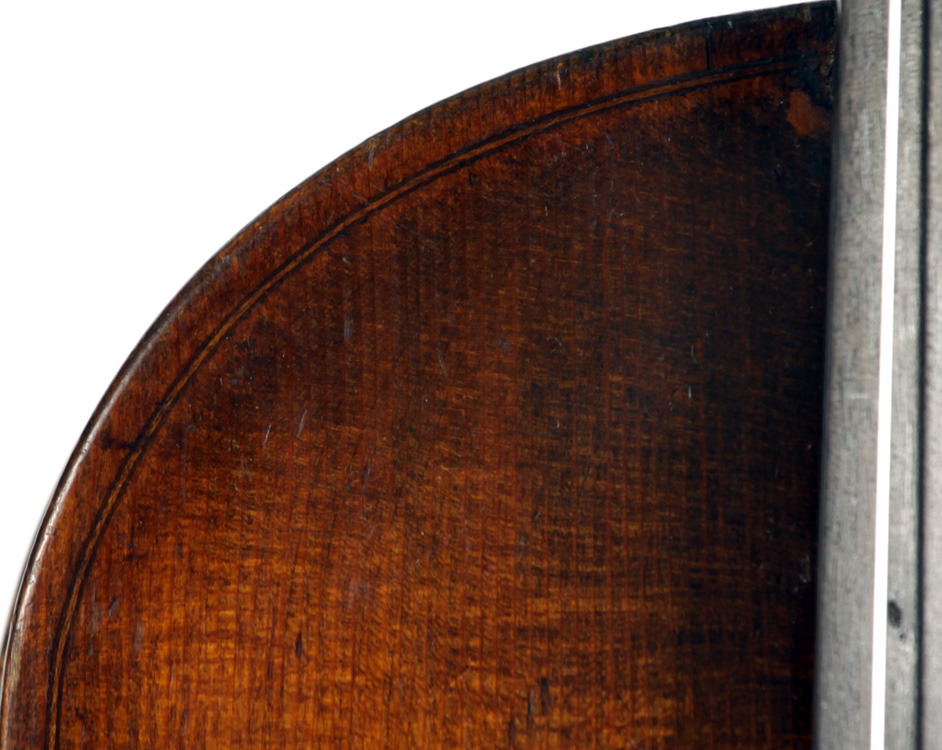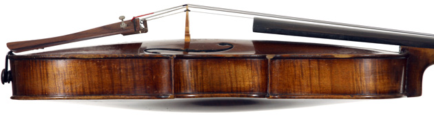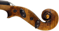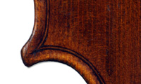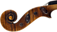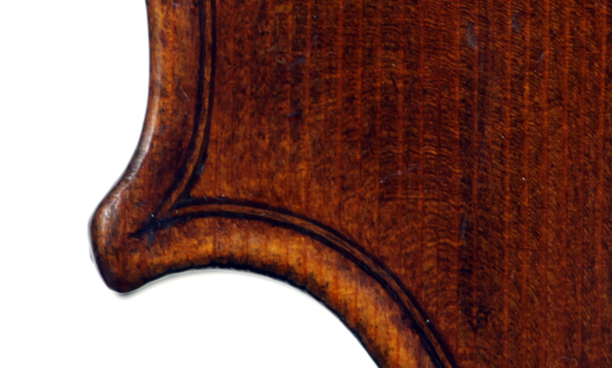 The two-piece back is of medium to finely curled maple with a distinct figure. The same material is used in the ribs, neck and scroll. The latter is somewhat perfunctory, as are the F's. Purfling and cornerwork is tidy, showing an experienced and steady hand. The top is of even medium-grained tone spruce and the brown varnish shows of the materials well. It quite clearly is a commercial instrument, aimed at entry level professional players.