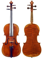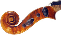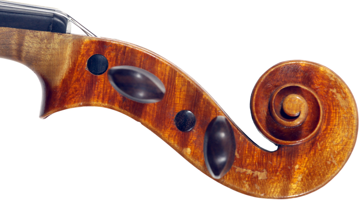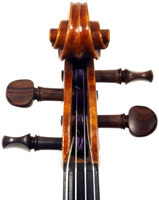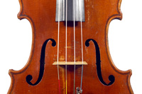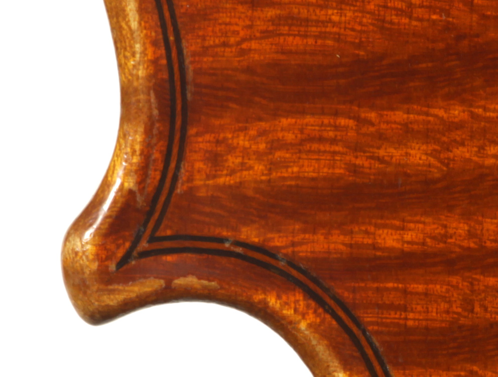 In this instrument the two-piece back, ribs, neck and scroll are of nicely figured maple with a straight even narrow to medium curl. The top is of fine tone spruce with narrow grain at the centre line widening to the flanks. Purfling and cornerwork is tidy and the scroll is nicely balanced. This viola is well-toned and responsive and a pleasure to play.