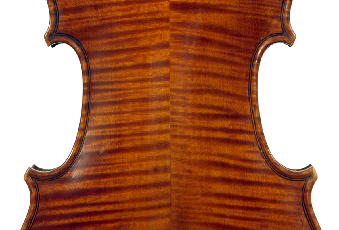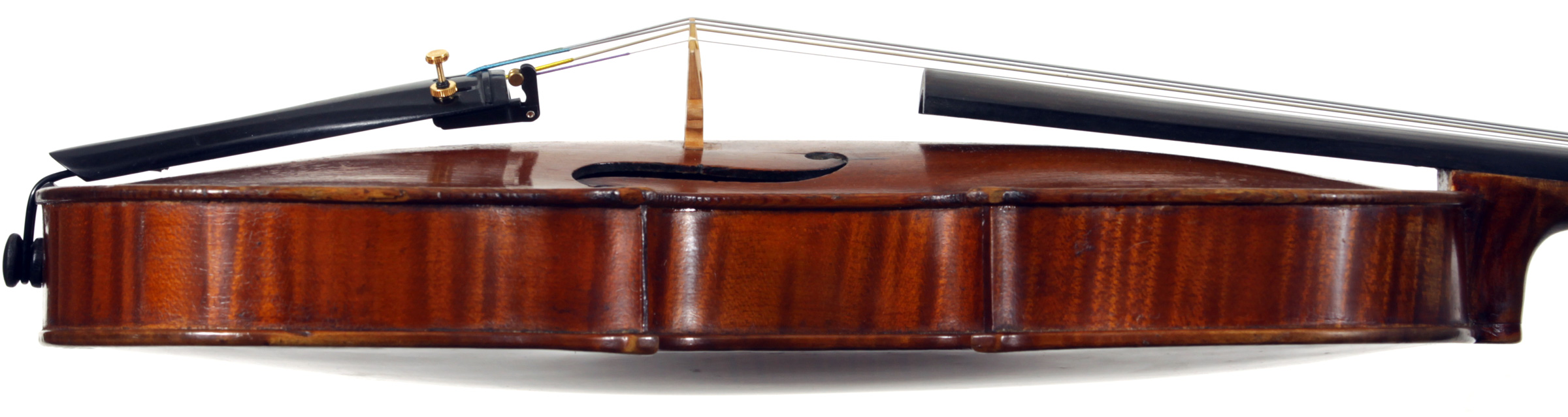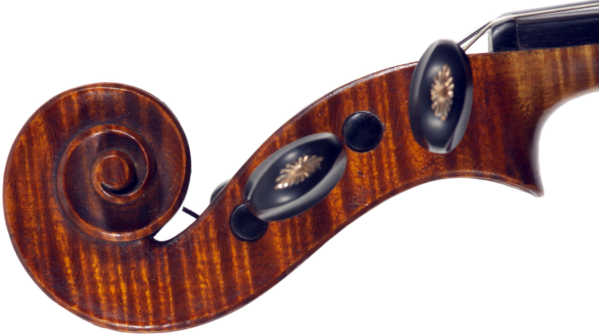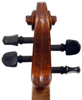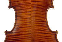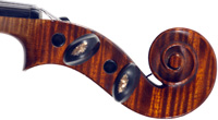 This violin has a truly magnificent scroll - bold, superbly balanced and champhered and with beautiful flame. The pegs are new. The two-piece maple back is of nicely flamed maple with a straight, medium curl, repeated in the ribs, neck and scroll. The top is of narrow to medium grained tone spruce. Varnish is brown.