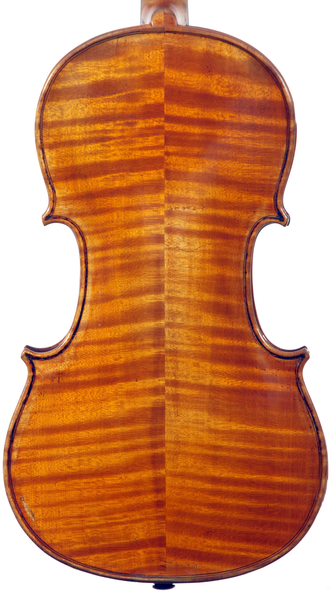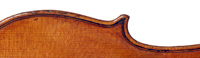 The materials selected for this violin are attractive and of good quality. The two-piece back, ribs, neck and scroll are of medium to broadly flamed maple with a distinct lively curl. The top is of medium-grain tonespruce with a straight and even winter growth. The varnish is beautiful golden amber of high transparency, complimenting the wood nicely.