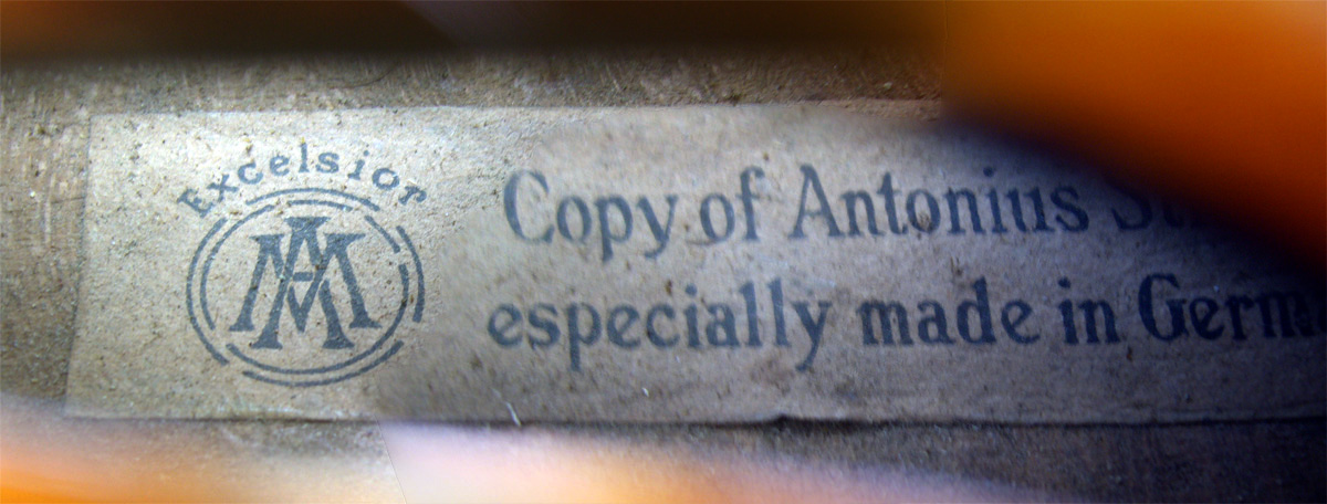 Although bearing the label of the English firm, Excelsior, this violin appears to be the product of Schuster & Co. of Markneukirchen, probably made around 1920. This is based on the interrupted fluting on the back of the scroll - a characteristic identifier of many of this firm's commercial violins. This instrument was no doubt imported to England, and the label acknowledges its German origin.