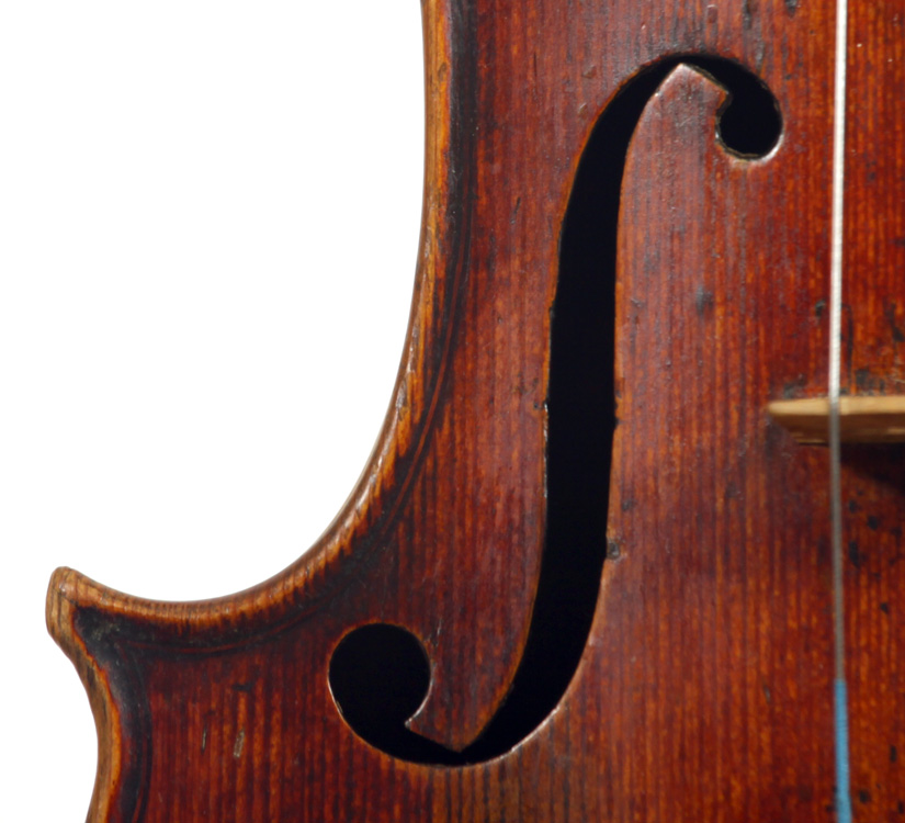 Structurally this violin is in superb condition except for two things: Firstly, it sustained some serious lengthwise gouges, or scratches to the treble side of the top, running from the inner edge of the treble F downwards. This may be the result of an ill-considered repair, very poorly executed. This can be restored by a master craftsman (see photos). Secondly, an attempt to clean the violin (probably by an amateur) resulted in the varnish being slightly compromised. This is not too serious and could be polished out by an expert. Other than that, this violin would benefit from a new set of pegs and possibly the restoration of one of the corners.