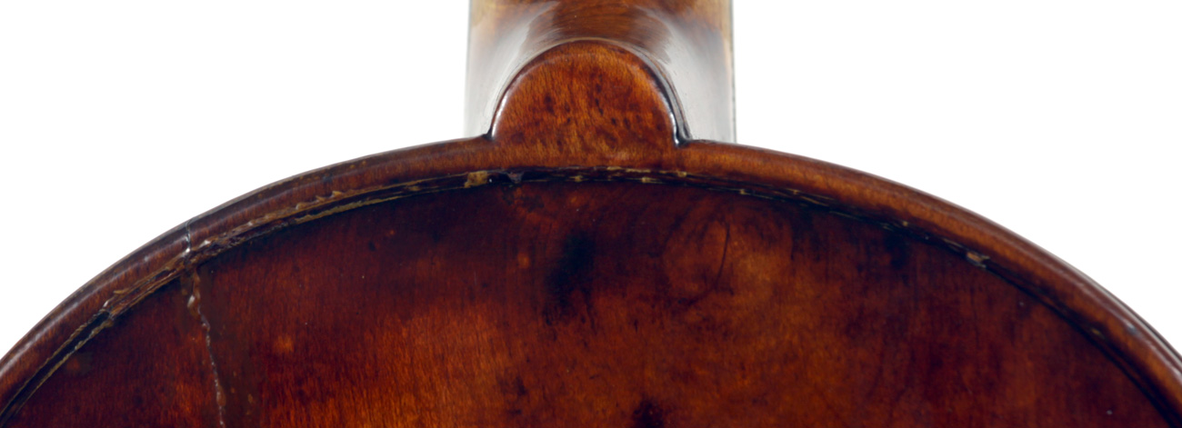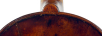 The one-piece back of somewhat plain unfigured wood is cut on the slab. The ribs appear to be of the same wood. The top is of finely grained tonespruce of excellent quality. Although this violin has seen some repairs to the scroll, the neck button and two cracks on the top - all superbly done - it can be said to be structurally in excellent condition.