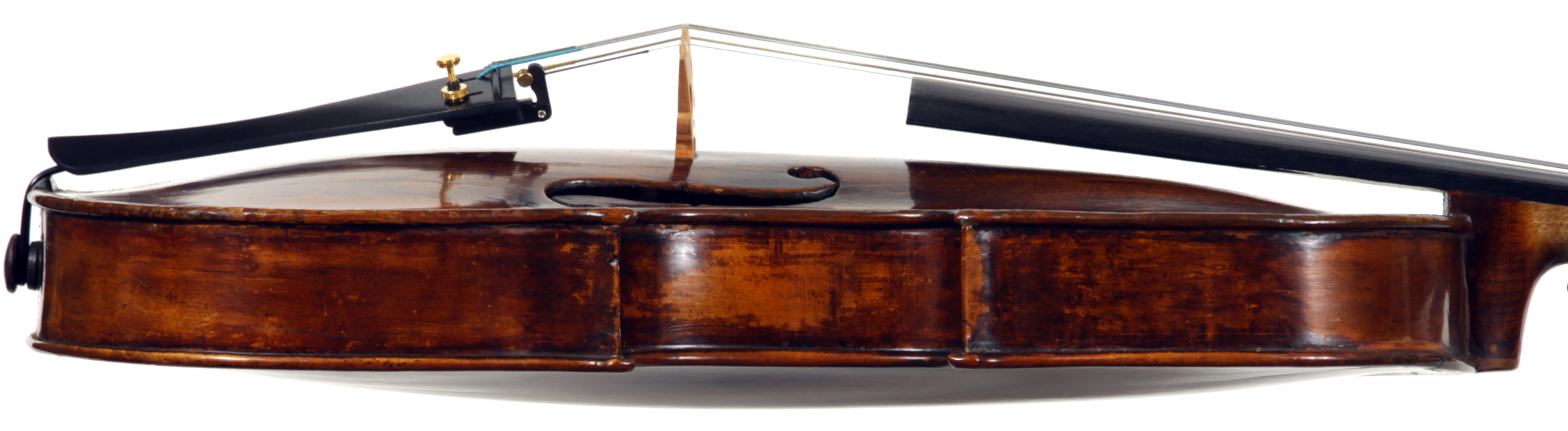 Considering its age, this violin is in a remarkably good condition for an instrument some 270 years old. Repairs to the scroll and to two cracks in the top were superbly done, evidently the work of a master craftsman. A crack in the back's upper treble quadrant and to the button area could have been better done and it appears that this crack is not cleated but merely glued. This instrument does not have a soundpost crack in the front or back and can be considered as being structurally very secure. This violin has been over-varnished, but it appears to have retained its original varnish underneath.