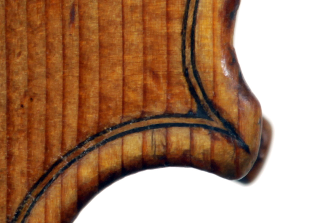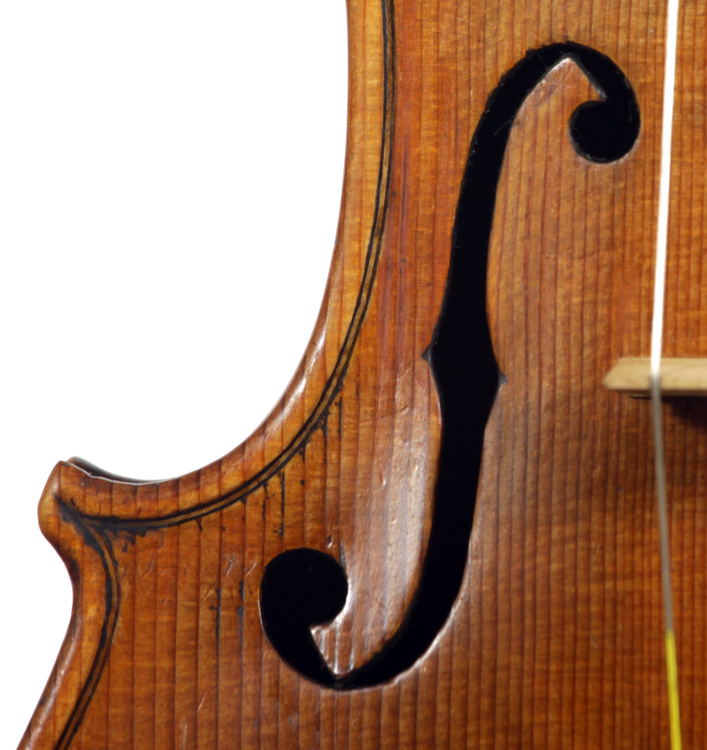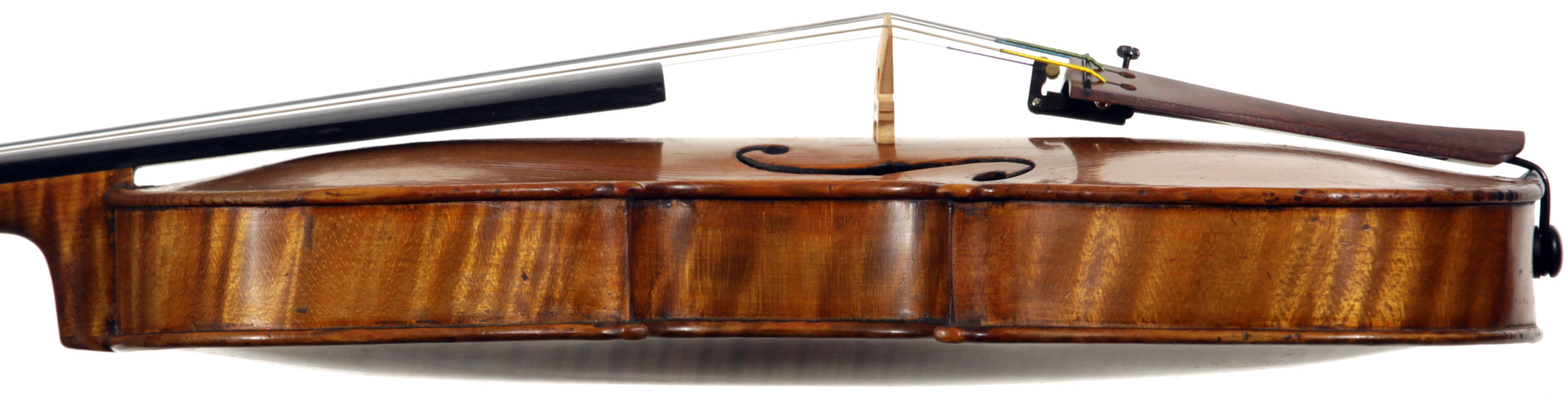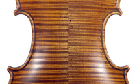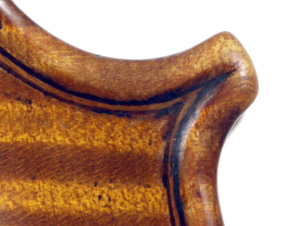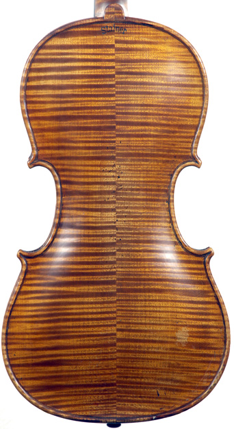 The two-piece back, ribs, neck and scroll are of very attractive maple with a distinct figure and even, medium curl. The table is of excellent tone spruce with narrow to medium grain. The varnish is light brown. Although the Fs and scroll are somewhat perfunctory, workmanship throughout is of very good quality.