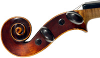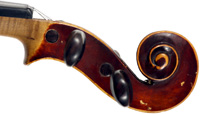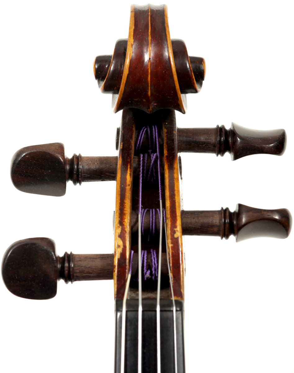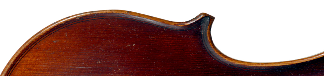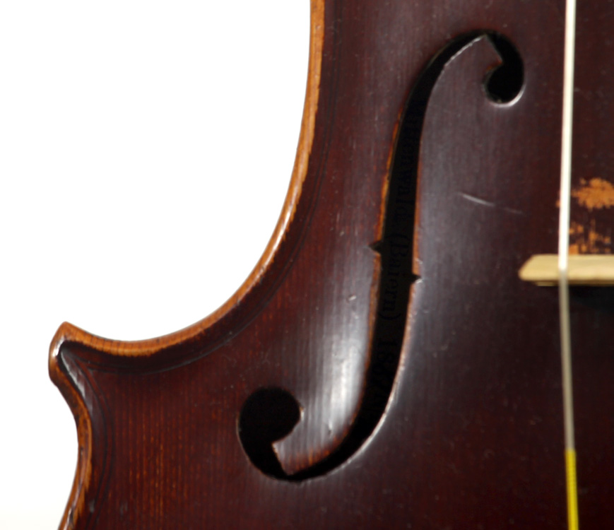 The two-piece back, ribs, neck and scroll are of mildly-flamed maple. The top is of narrow-grained tone spruce. The Fs are elegant. The oil-based varnish is a dark red-brown and somewhat opaque. This violin is responsive and well-toned, speaking easily through the full register. It would be eminently suitable for an advanced upgrade or entry-level professional performance.