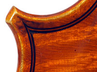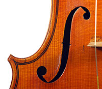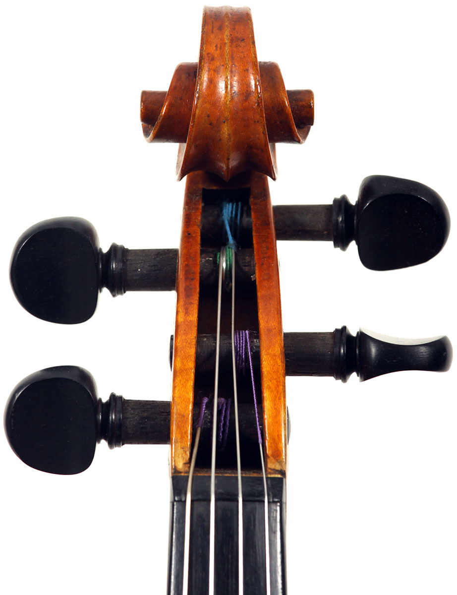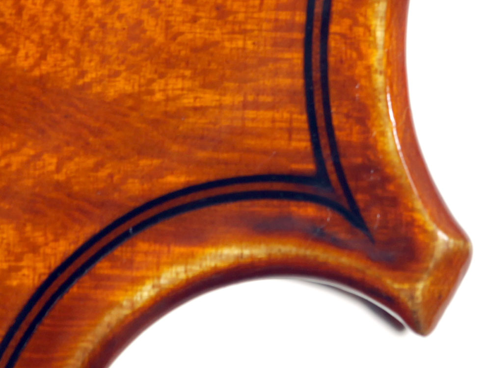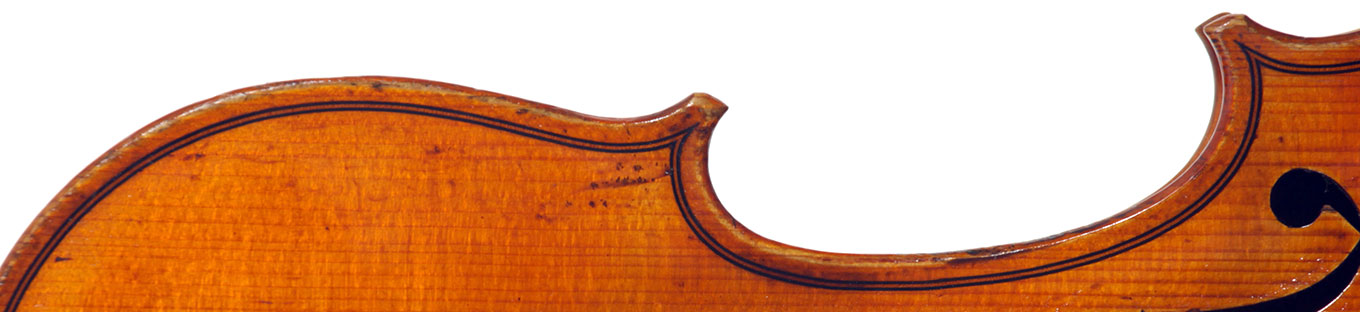 This violin clearly shows workmanship and modelling associated with French lutherie and can be assumed to have been made in Mirecourt for Haynes & Co. One is struck by the unusually tidy work with excellent attention to detail. The Fs are particularly elegant and crisp as is the scroll with its beautifully finished fluting. The purfling and mitres are superb throughout. The choice of materials is excellent - the tonespruce top is narrow grained on the centre line, and widens to the flanks. The two-piece back, ribs, neck and scroll are of attractive well-figured maple with a medium curl and distinct flame. The golden reddish brown oil-based varnish compliments the material well, adding to the visual appeal of this instrument.
