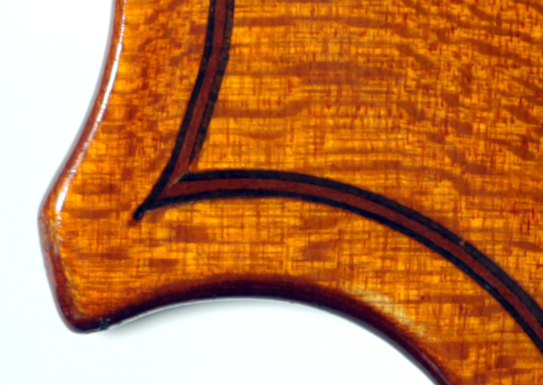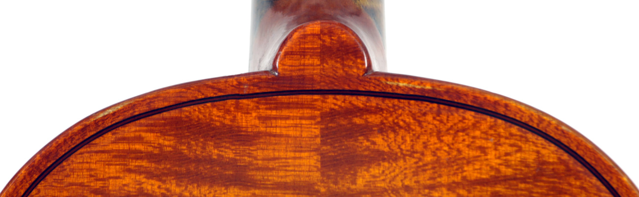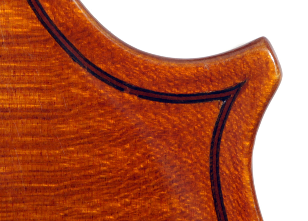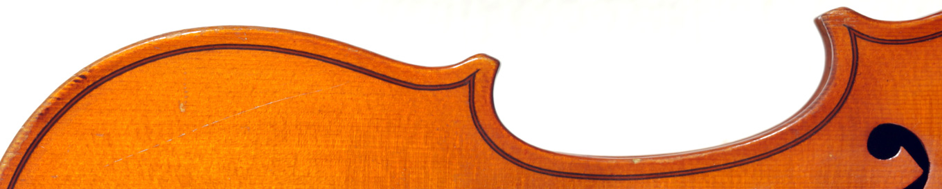 It is labelled as by C. A. Götz, made in 1989. General workmanship and varnish would imply trade (commercial) origins, but is nonetheless of high standard with excellent attention to detail. It's an attractive instrument. Purfling and cornerwork are superb and the Fs balanced and elegant. The choice of material is good - the two-piece back, ribs, neck and scroll are of mildly flamed maple with an even medium curl, evidently made from the same piece of wood. The top is of excellent tone spruce of very even and narrow winter growth.