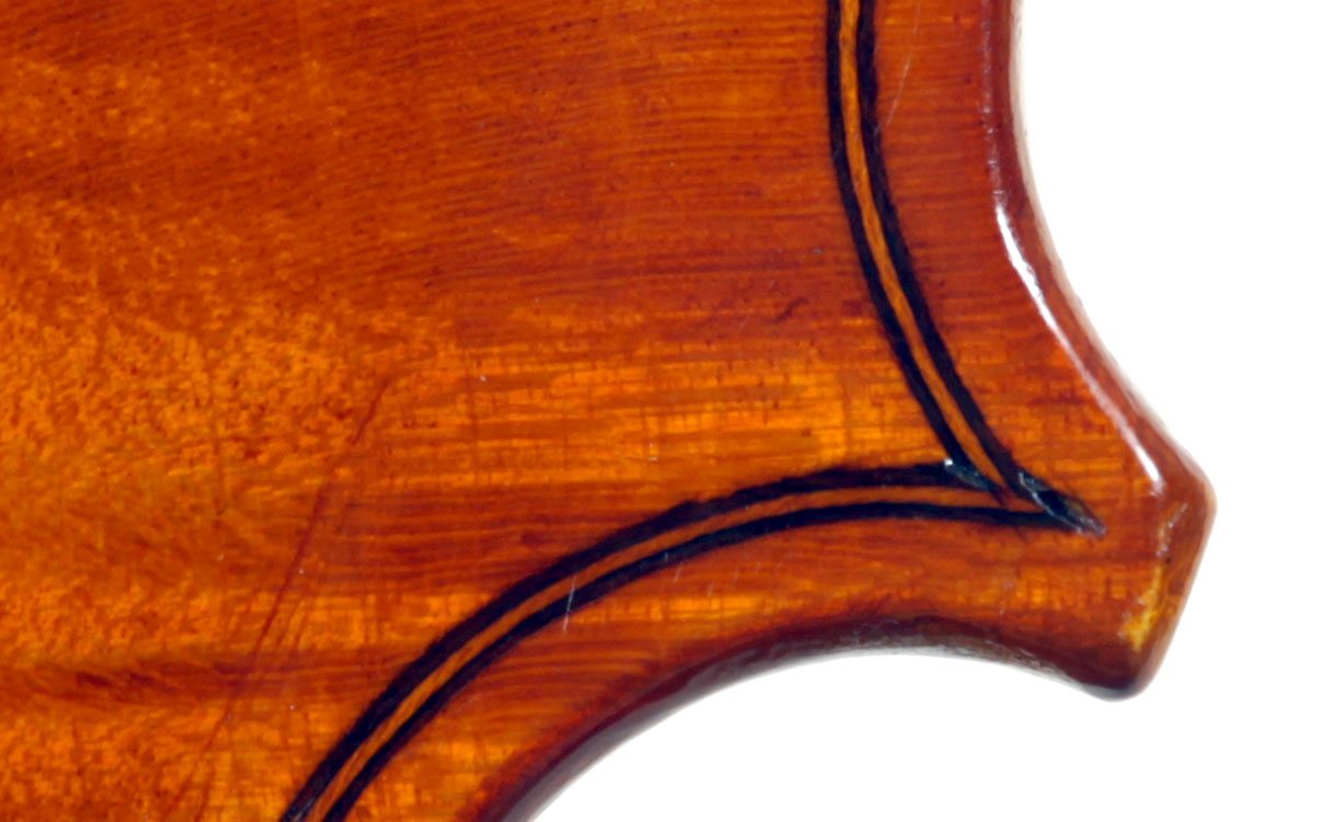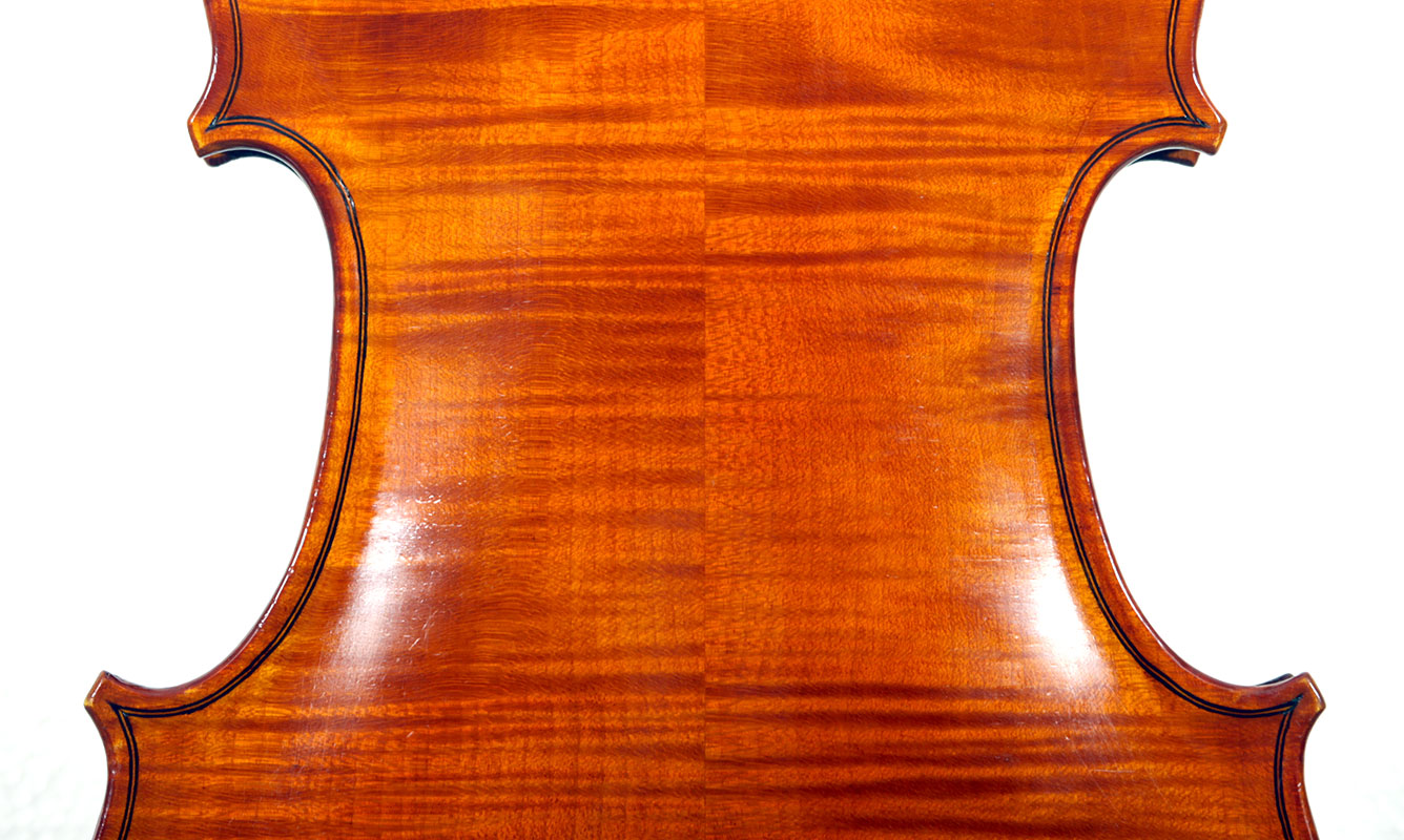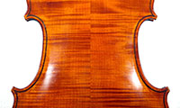 This instrument is made of a fine selection of materials - the two-piece back and ribs are of well-flamed maple with a narrow to medium curl - repeated in the neck and scroll. The top is of good tone spruce with a narrow even, very straight medium grain. The scroll and purfling are steady. The oil-based varnish is an attractive golden brown which complements the materials well.
