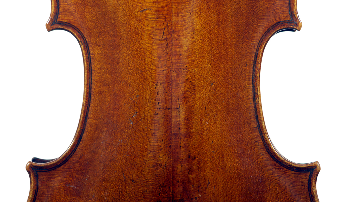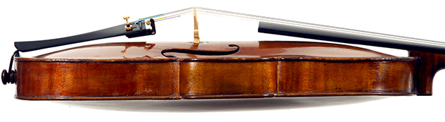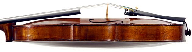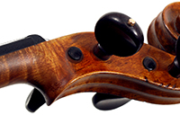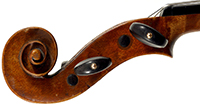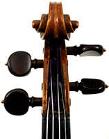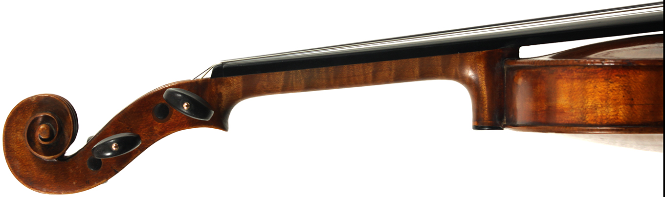 The two-piece back, ribs and scroll are of rather plain wood, whereas the top is of excellent tone spruce of medium-width grain. The scroll is delicate and well-balanced. The neck graft and the peghole bushings are of very fine workmanship. The varnish is a golden brown.