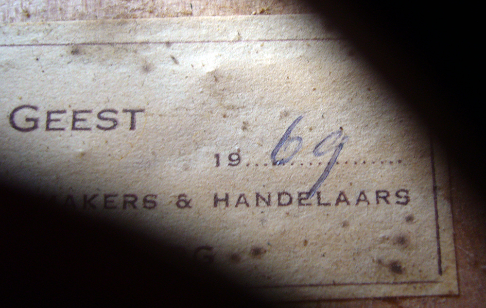 Apart from his own personal output as violinmaker, J. J. van de Geest imported 'trade' (commercial) instruments aimed at the student and amateur market from mainly Germany, Holland and Japan. Such instruments were usually of reasonably good quality and he always labelled them as Made for J J van de Geest, followed by additional information, such as a serial number, date, address etc. These instruments were NOT made by J. J. van de Geest, but were the output of large trade studios (a euphemism for 'factories'). These instruments (including a large number of violas, cellos and child instruments), emerge all over South Africa.
