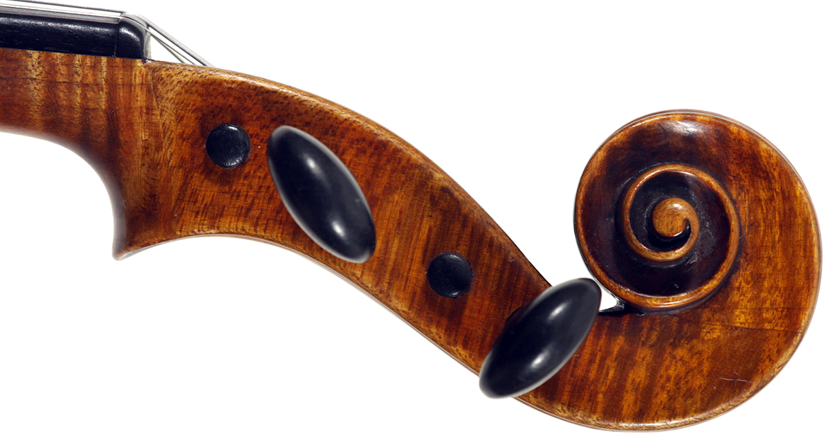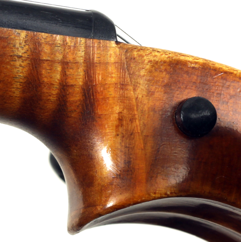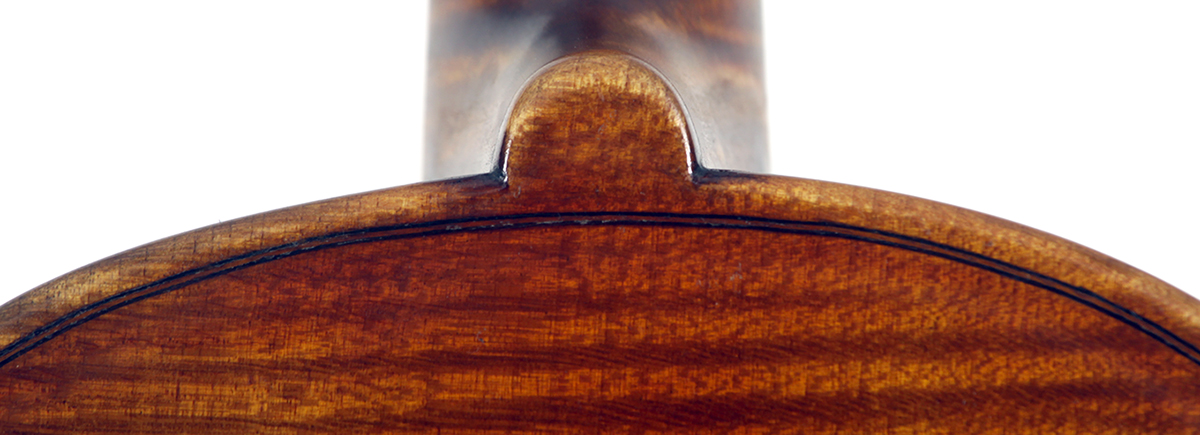 Everything about this instrument speaks of attention to detail: the choice of materials and workmanship are truly excellent throughout. The golden-brown varnish appears to be oil based and of high transparency, beautifully complimenting the wood. The purfling is superbly traced with carefully executed mitres. It's particularly the scroll that impresses - it is beautifully finished and impeccably balanced, with exceptional elegance and refinement.