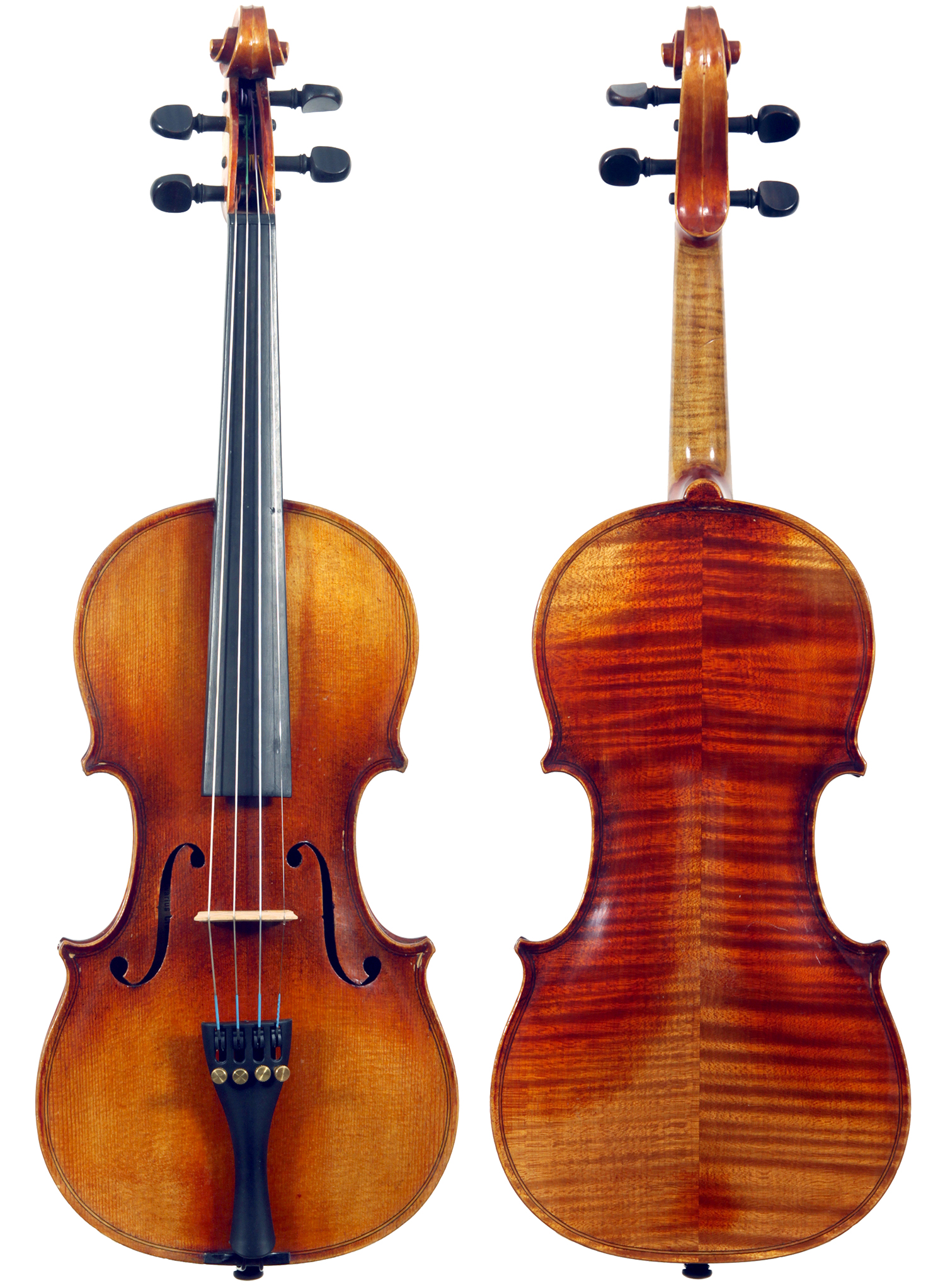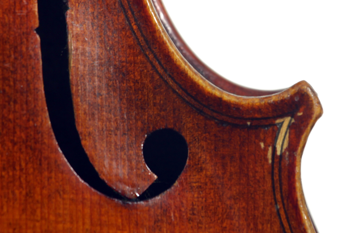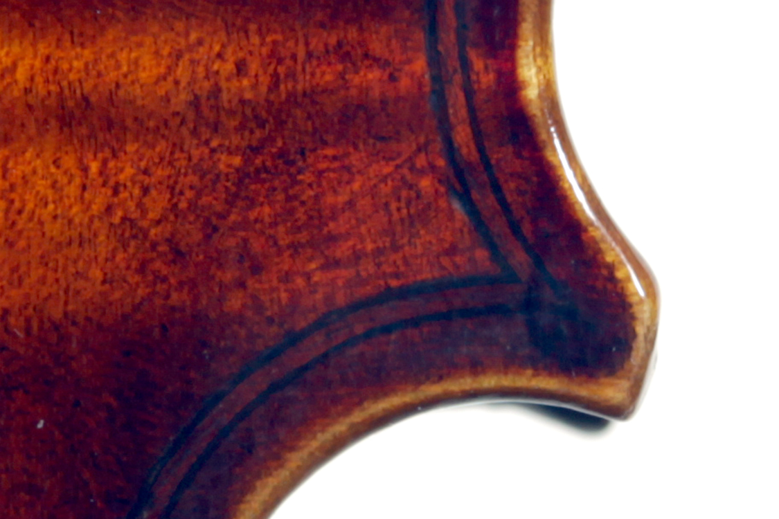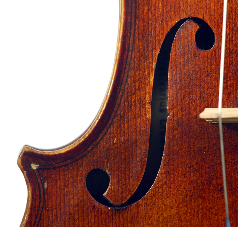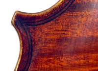 One notices the beautiful well-flamed maple used in the two-piece back, ribs, neck and scroll, along with the lovely amber varnish that beautifully compliments the wood. Workmanship throughout is refined with attention to detail.