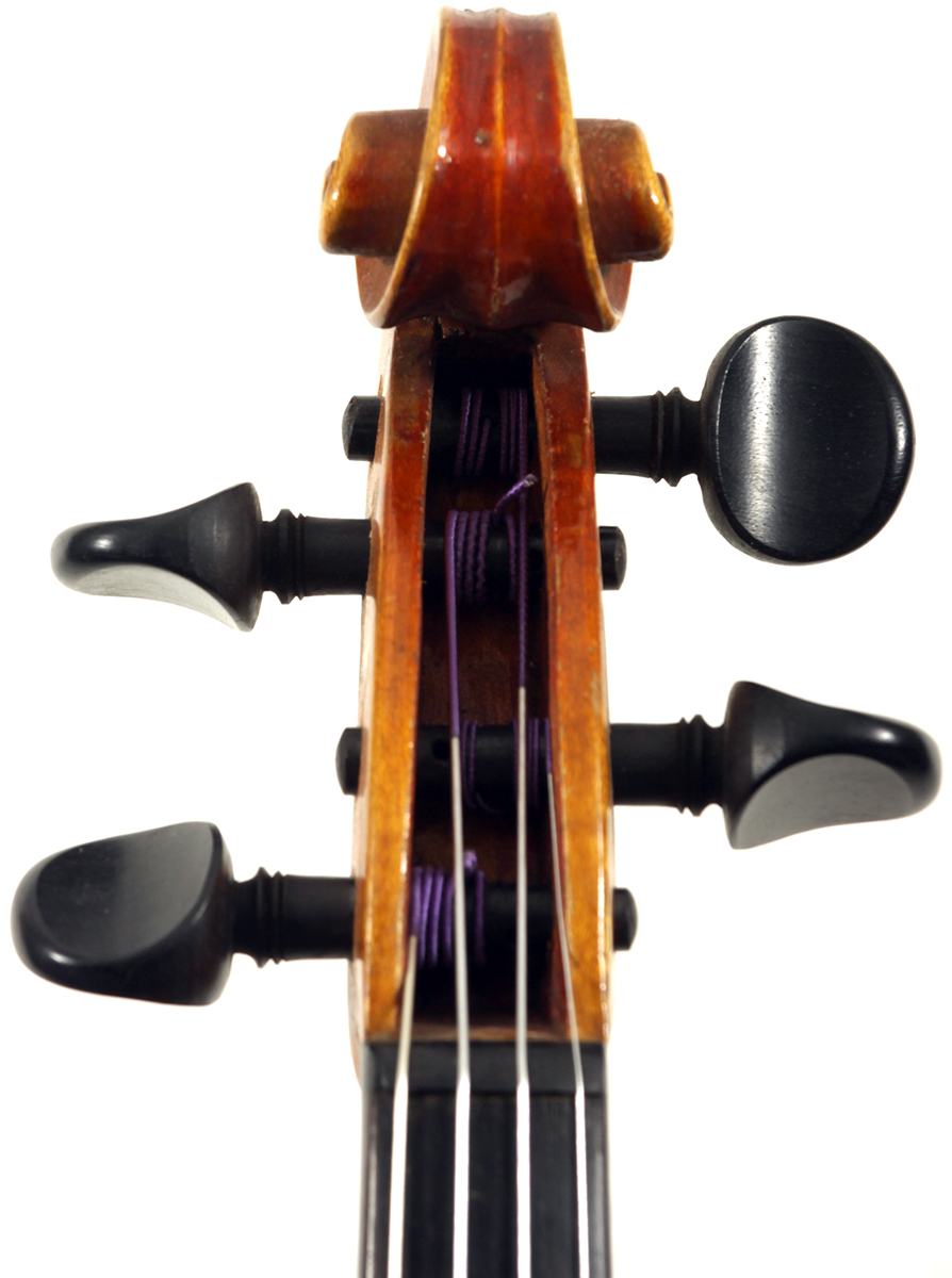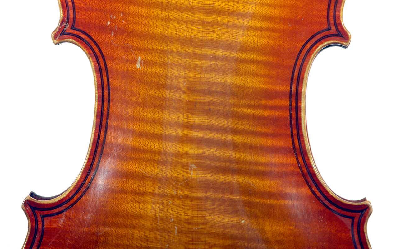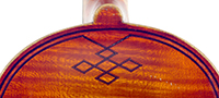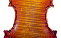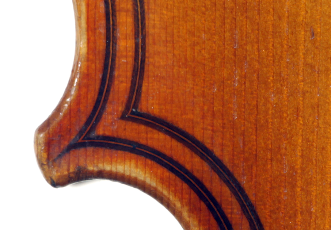 The top is of very good quality tone spruce with a straight and even medium grain. The one piece back, ribs, neck and scroll are of mildly flamed maple. The scroll is highly perfunctory, lacking the additional curl associated with Da Salo's work. The spirit-based varnish is a golden brown with a touch of red in it. The double purfling (a characteristic of Da Salo) is well-traced and tidy, both the front and back. There are also two purfling figures in the back (see photos)