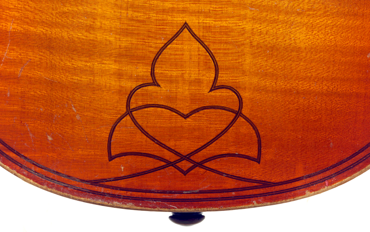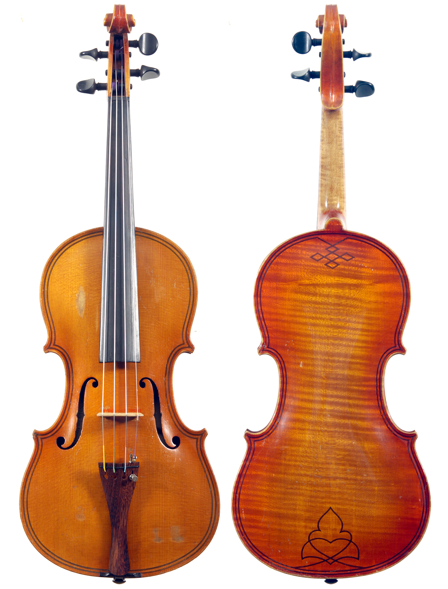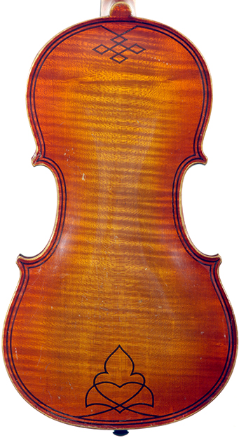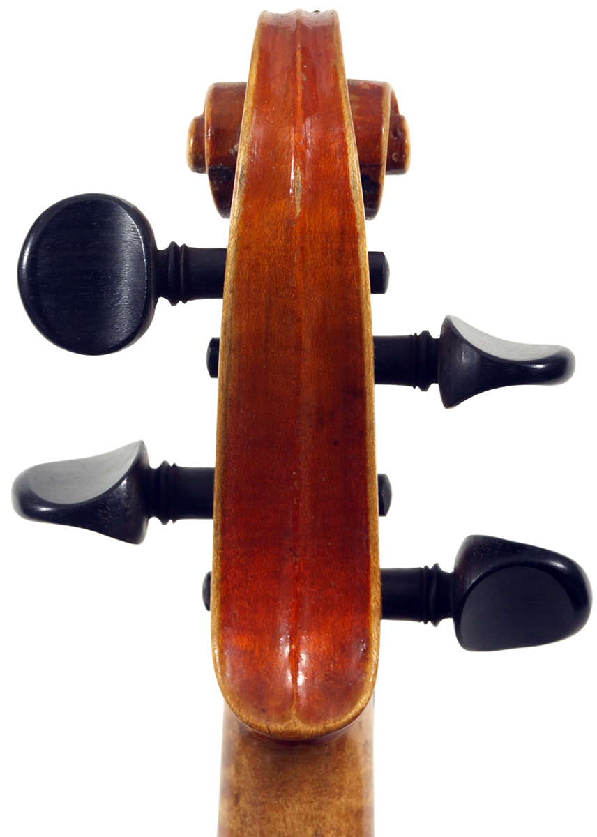 The top is of very good quality tone spruce with a straight and even medium grain. The one piece back, ribs, neck and scroll are of mildly flamed maple. The scroll is highly perfunctory, lacking the additional curl associated with Da Salo's work. The spirit-based varnish is a golden brown with a touch of red in it. The double purfling (a characteristic of Da Salo) is well-traced and tidy, both the front and back. There are also two purfling figures in the back (see photos)