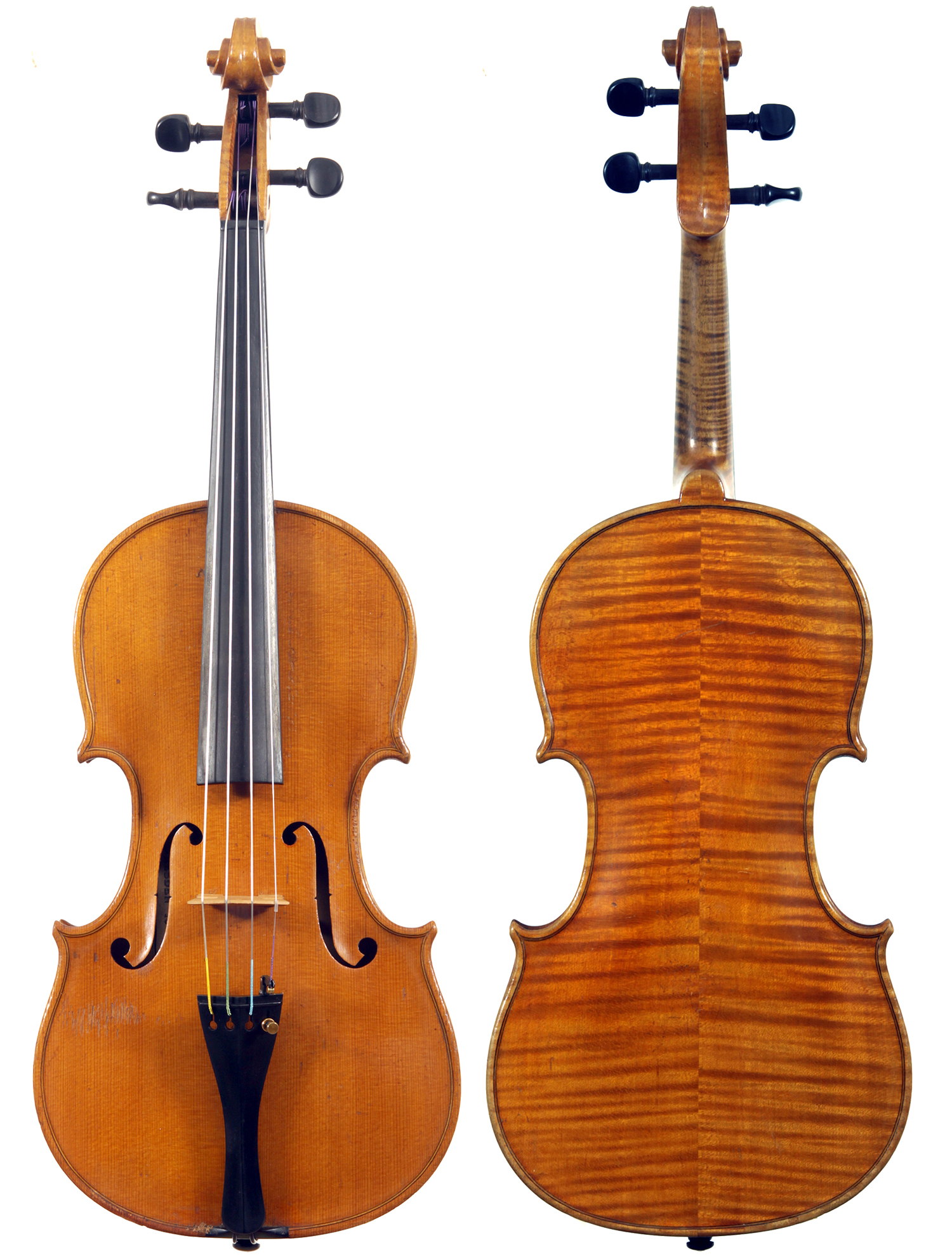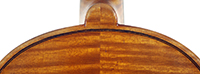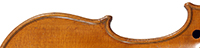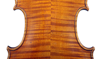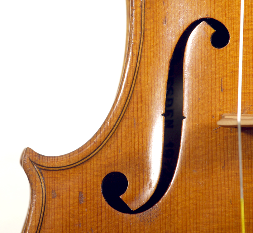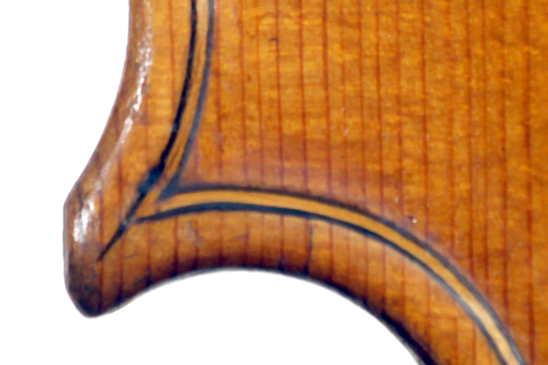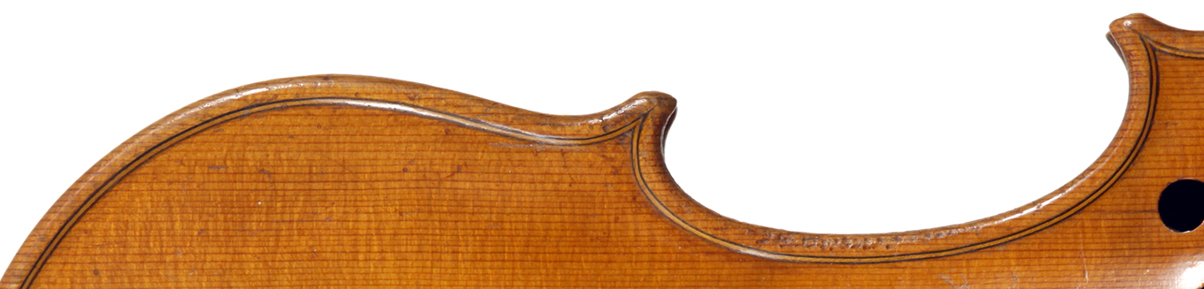 The two-piece back, ribs, neck and scroll are of well-figured maple with a medium straight curl. The top is of excellent tone spruce. Purfling and particularly the mitres show refinement and attention to detail. The scroll is nicely finished and balanced and the lower palettes in the Fs are nicely fluted. The golden spirit varnish is very transparent, beautifully complimenting the wood. All of the above set this instrument apart as a serious violin of serious intent.