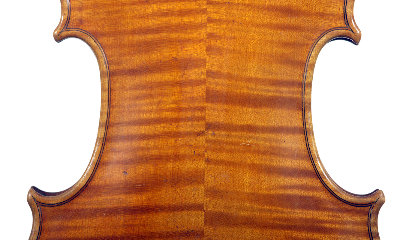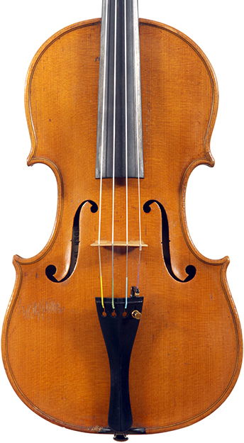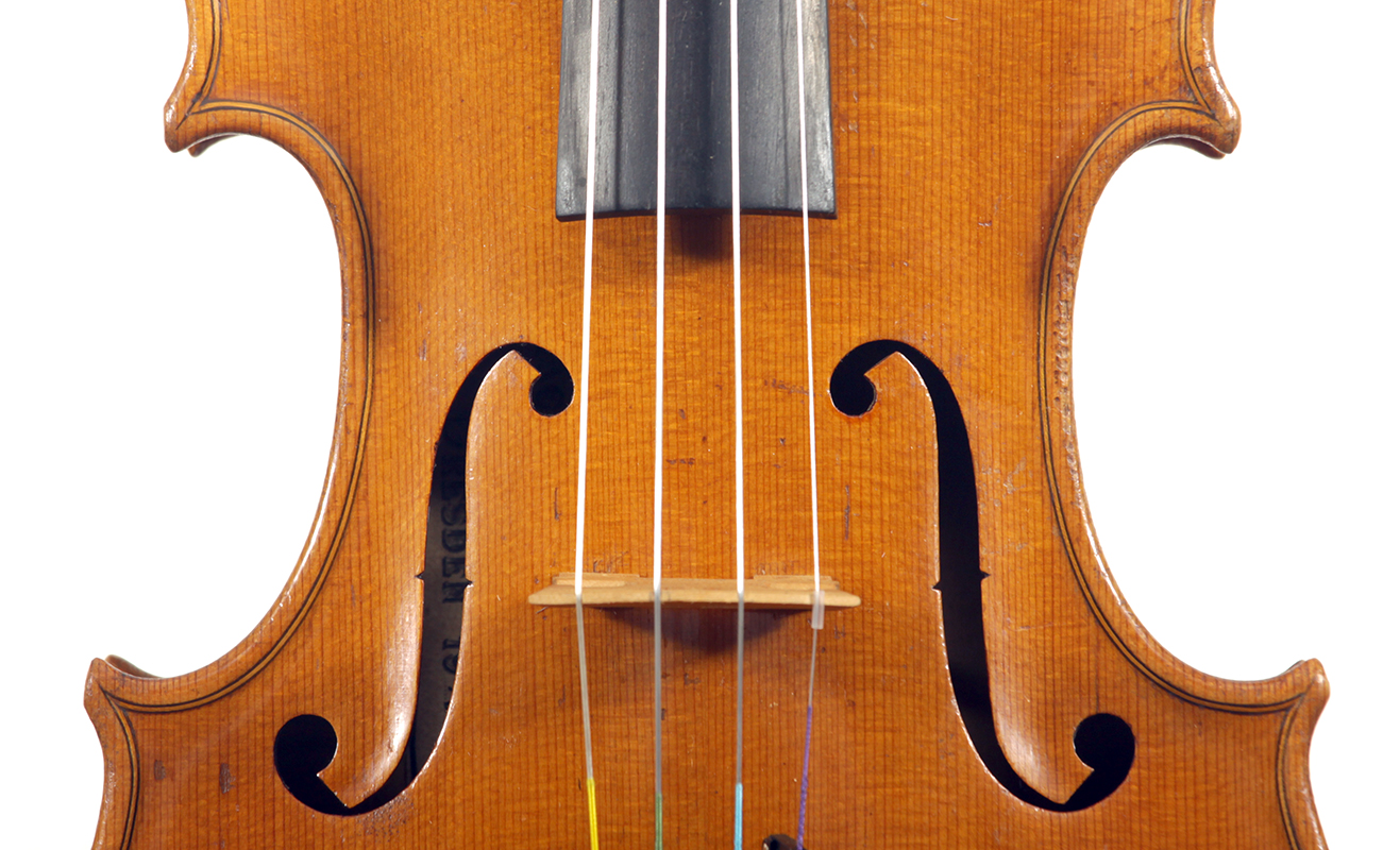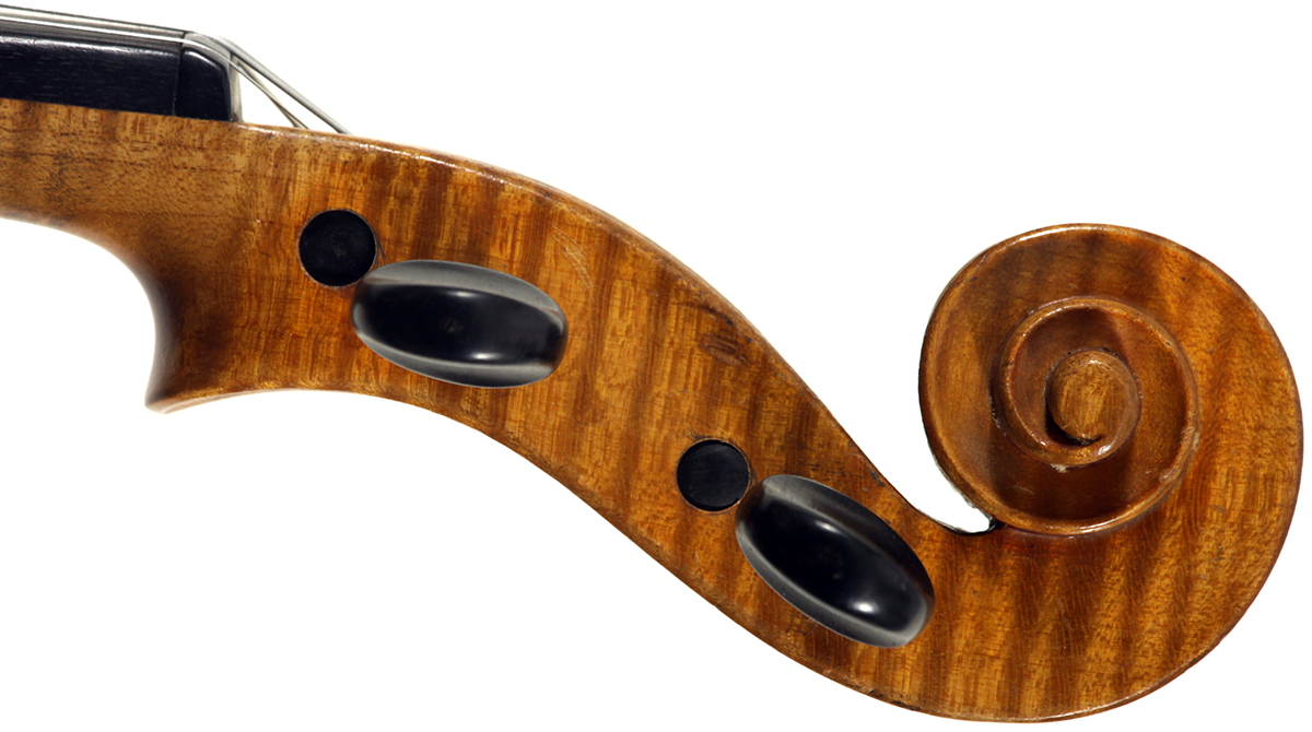 The two-piece back, ribs, neck and scroll are of well-figured maple with a medium straight curl. The top is of excellent tone spruce. Purfling and particularly the mitres show refinement and attention to detail. The scroll is nicely finished and balanced and the lower palettes in the Fs are nicely fluted. The golden spirit varnish is very transparent, beautifully complimenting the wood. All of the above set this instrument apart as a serious violin of serious intent.