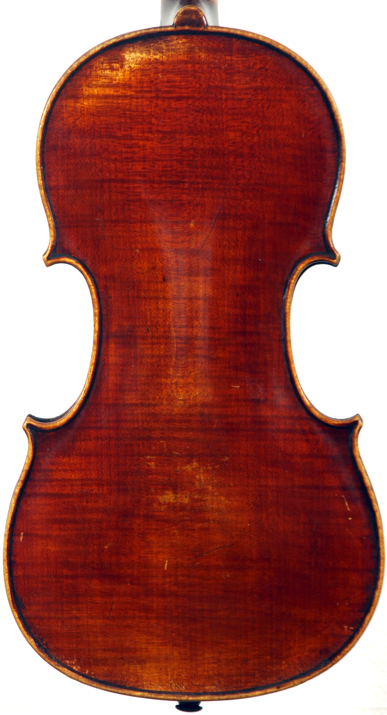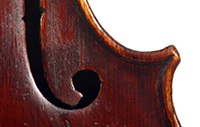 The beautiful one-piece back and ribs are of good maple with a mild narrow curl. The top is of excellent tone spruce. The neck and scroll appear to be not of maple but probably of birch. The oil-based varnish is the original throughout, somewhat worn in the usual places, and its deep red being truly beautiful.