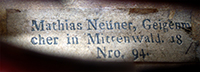 The label corresponds exactly to known labels of Mathias Neuner (1762-1830) and it can be assumed that the violin was made in Mittenwald. Furthermore, the deep red varnish corresponds to William Henley's comment that the varnish of this maker's instruments oxidised from the original reddish brown to a deep red over time, adding to the overall sense of authenticity associated with this violin.