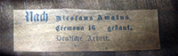 The label clearly shows that this is German work. The choice of material shows discernment - the two-piece back, ribs, neck and scroll are evidently of the same piece of wood - attractive nicely flamed maple with a distinct medium curl, shown off well in the ribs. The top is a good choice of excellent tone spruce with narrow winter growth at the centre line, widening out only slightly to the flanks. The golden brown varnish appears to be oil-based and of high transparency. Workmanship is truly refined with attention to detail.