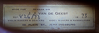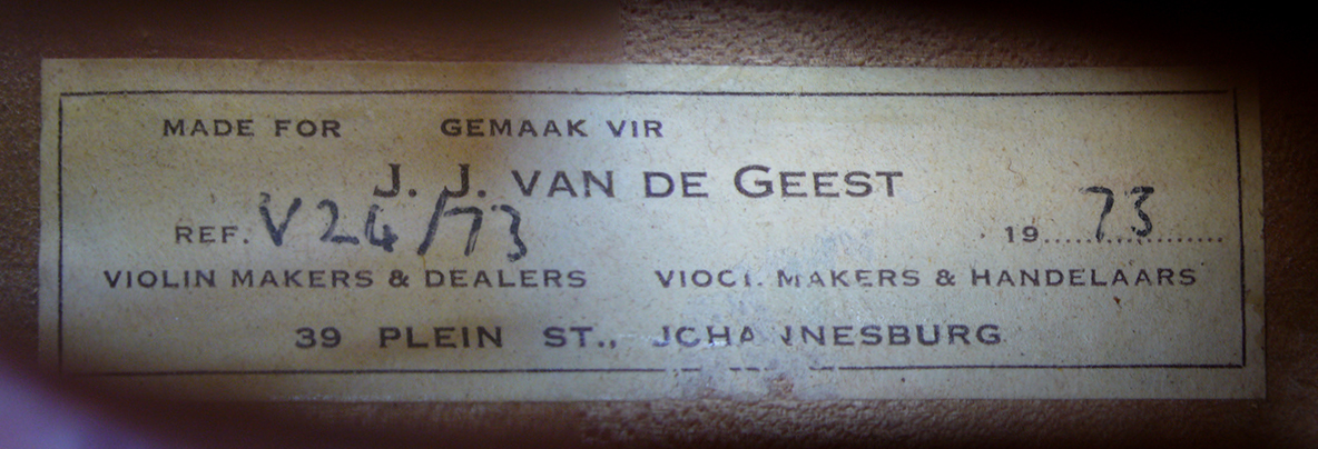 The important Dutch violin maker, J. J. Van de Geest (1899-1974) settled in Johannesburg in 1938 after working in London for George Hart & Son for 18 years as master of the studio. Apart from his personal work as maker he imported many instruments of various grades from different suppliers, mostly German and Dutch - these instruments were all labelled 'Made for J. J. Van de Geest'. This viola bears this label and is dated 1973, probably of German origin.