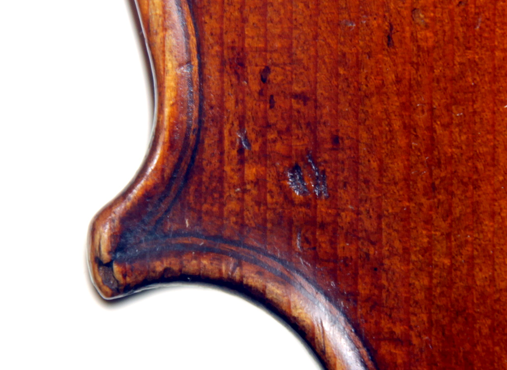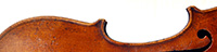 The two piece back, ribs, neck and scroll are of attractive, nicely-flamed maple with a medium to broad curl. The top is of excellent medium grain tone spruce. The varnish appears to be oil based and compliments the materials well. Workmanship throughout is refined and of high quality. The scroll in particular is very well balanced.
