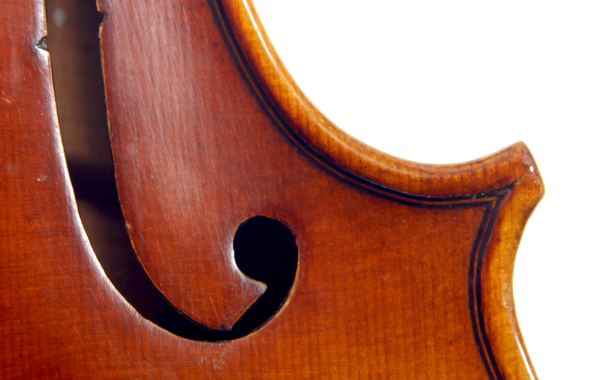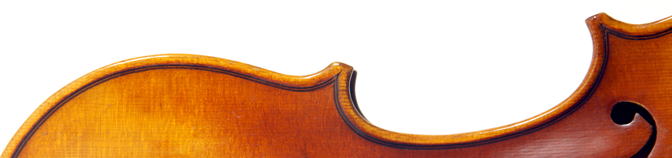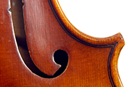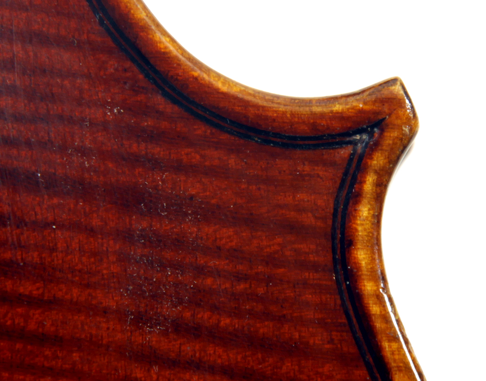 The two-piece back and ribs are of nicely figured maple with a distinct very narrow and straight curl. This is repeated in the neck and scroll. The varnish is an attractive reddish brown, graded to the yellow ground. Workmanship throughout is refined and accurate.