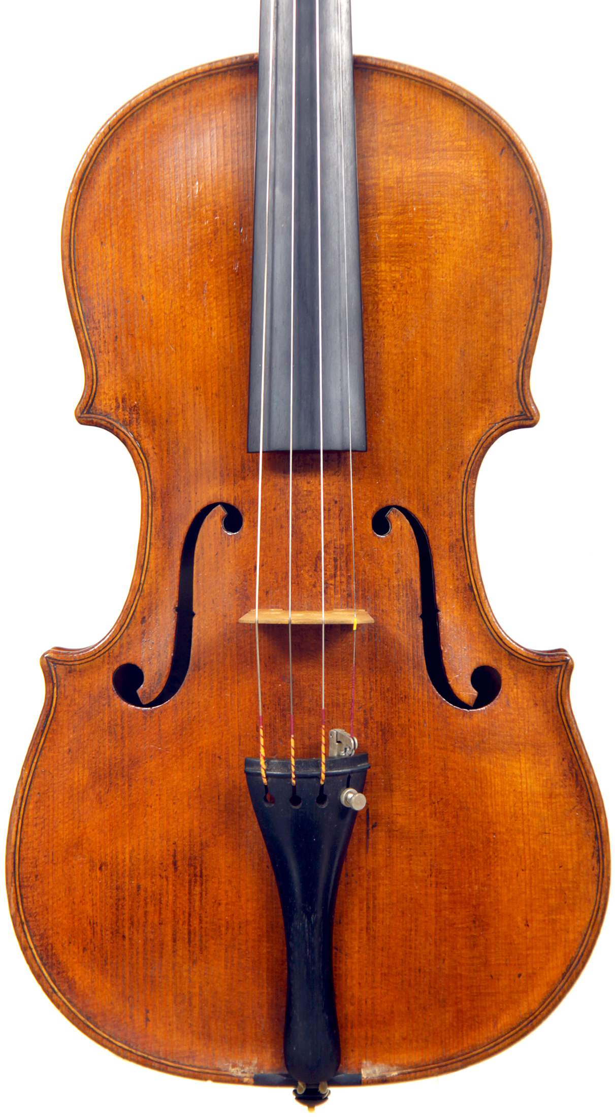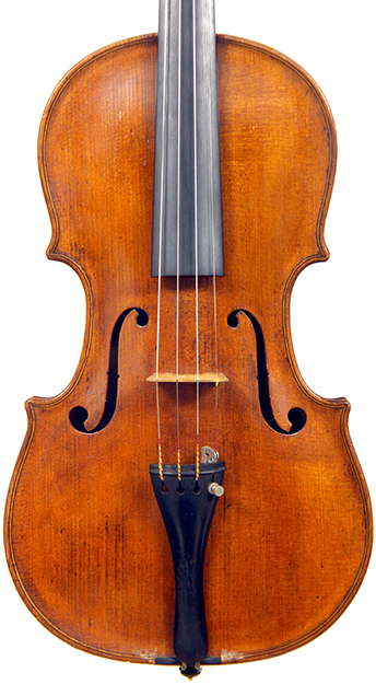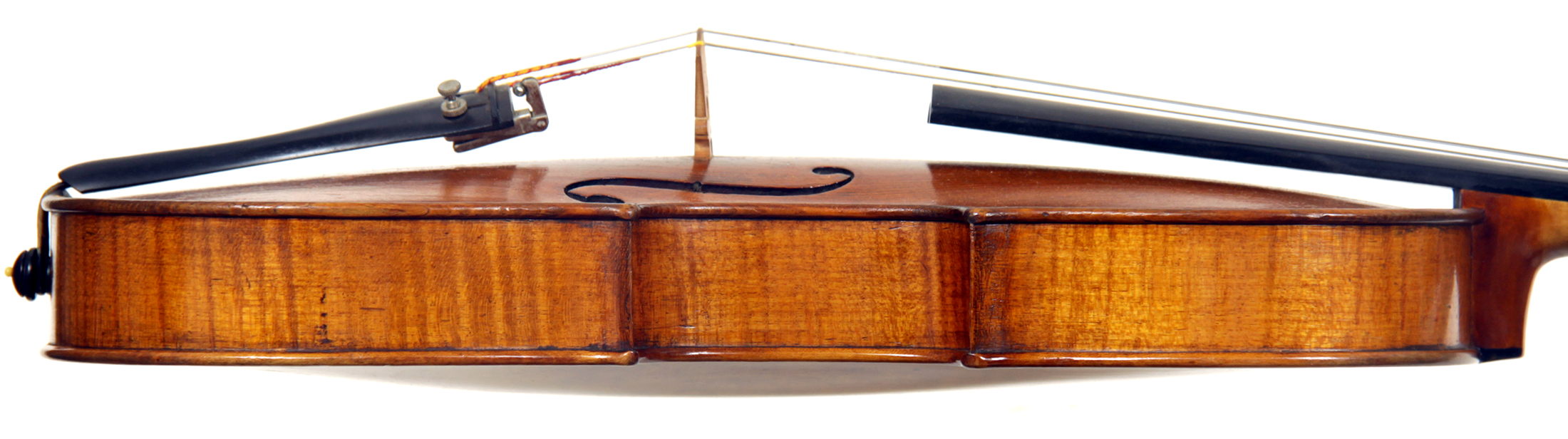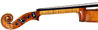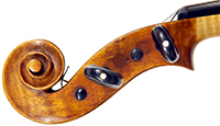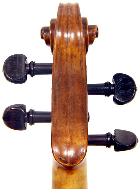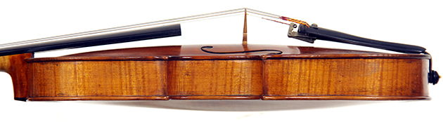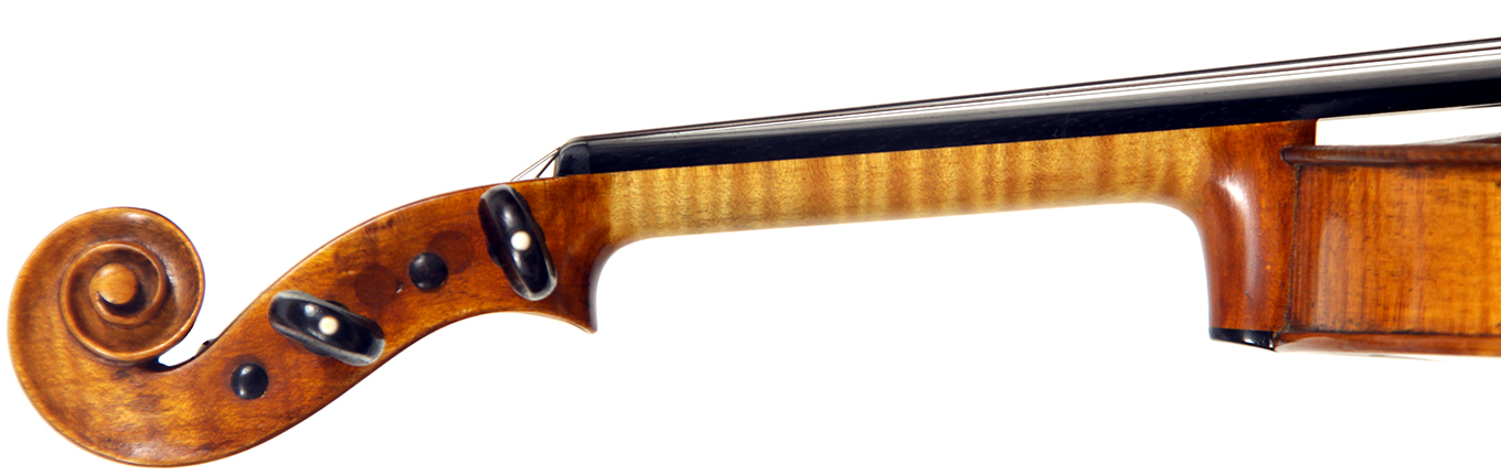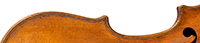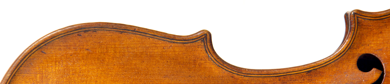 This violin throughout shows a steady hand with attention to detail in all respects. The choice of materials is good; the two-piece back, ribs and scroll are of good mildly flamed maple with a narrow to medium curl. The neck appears to be later. The top is of good tone spruce and the purfling is tidy throughout. The golden-brown varnish is appealing to the eye.
