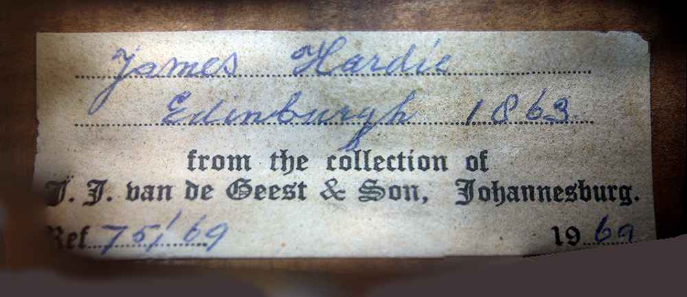 The important Dutch authority, J. J. van de Geest, relabelled this violin to indicate that it was part of his collection and was made by James Hardy in Edinburgh in 1863. This serves as adequate certification of origin since Van de Geest was a master craftsman who had been the workshop overseer for George Hart & Son in London for 18 years until 1938. He was internationally respected as authority until his death in 1974.
