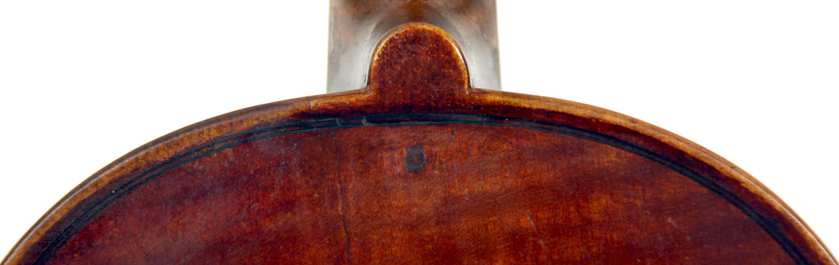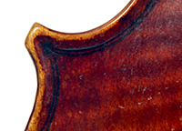The beautiful wine-red varnish is untouched, though slightly worn in the usual places. The one-piece back and ribs are of attractive mildly flamed maple with a medium curl repeated in the neck and scroll. The tone spruce top is of very fine grain. Workmanship throughout is excellent.