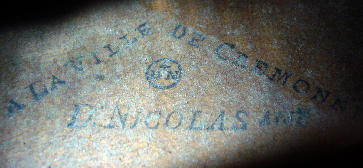 This is an excellent example of the work of the important French maker, Didier Nicolas l'aîné (1757- 1833). Not only is it visually very appealing, but it is very well-toned and suitable for solo performance. It bears the maker's characteristic triangular brand inside in the back and is sold with a 1945 certificate of authenticity by John and Arthur Beare. It is undated and probably made around 1825.