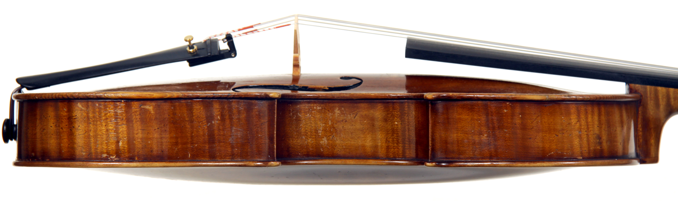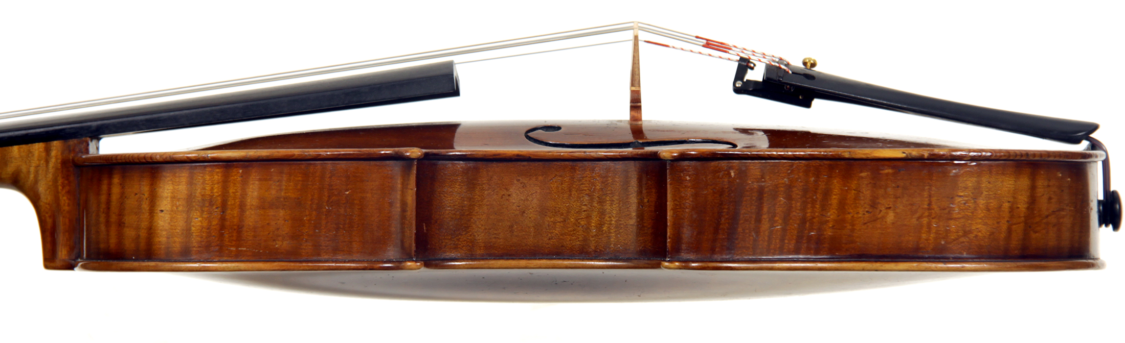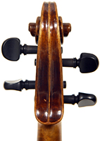 The choice of materials and the standard of workmanship in this viola are exceptionally high, culminating in a very attractive instrument with immediate appeal. The two-piece back shows a mildly flamed maple of medium curl, whereas the ribs, neck and scroll are all of more distinct flame with a narrower curl. The top is of superb tone spruce with a medium grain throughout. The oil varnish is truly beautiful - light brown and of high transparency.