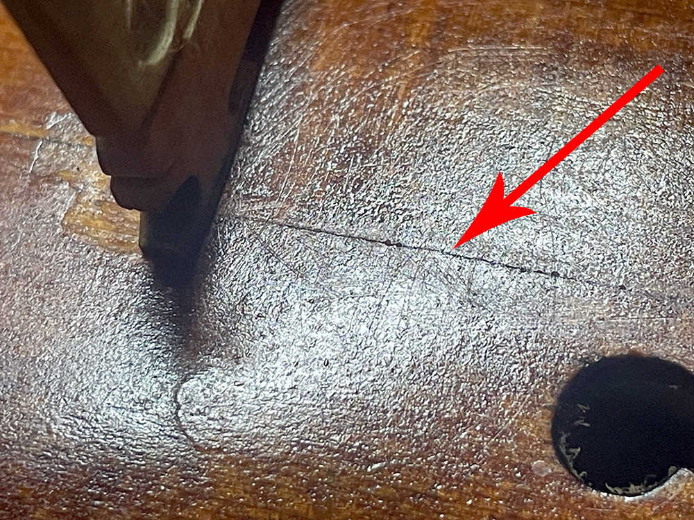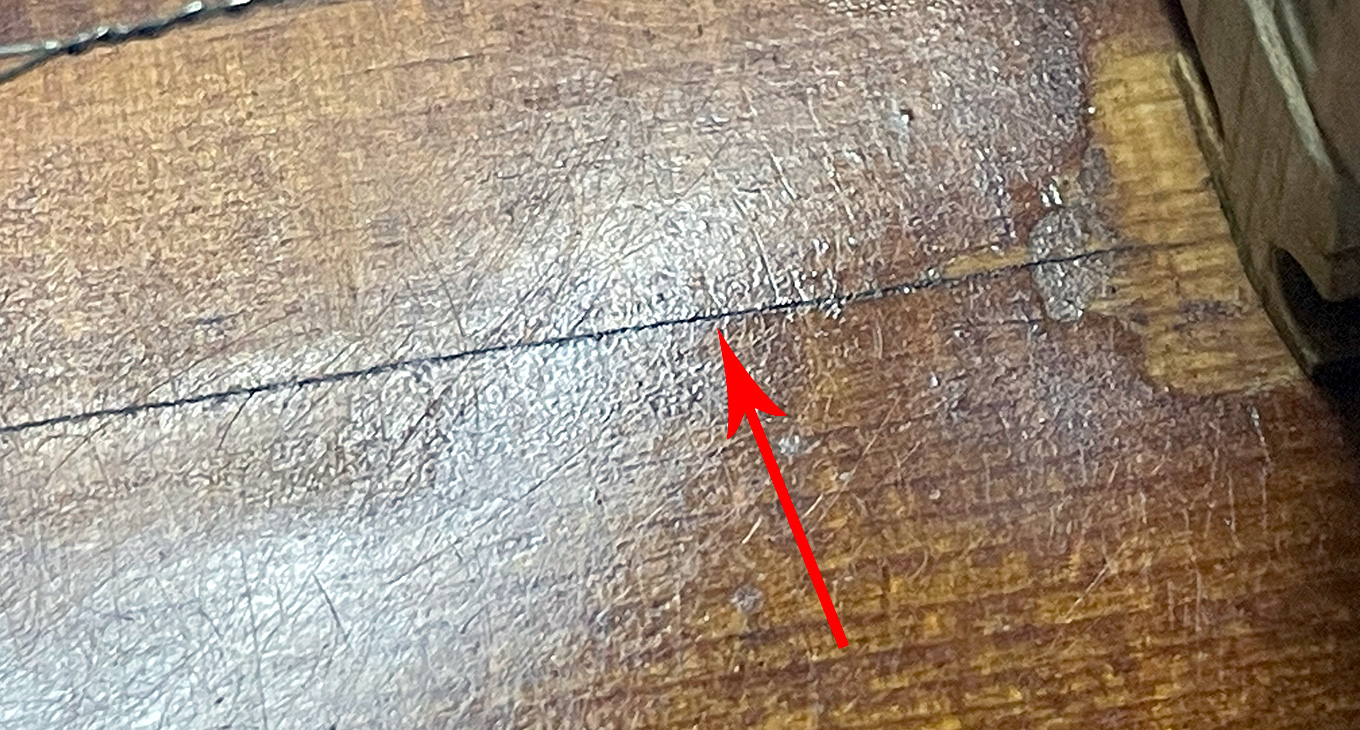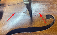 Secondly, the corner by the bass F in the top is broken off and the corner should be rebuilt. Although this has no tonal implications, I feel that this is a structural and aesthetic fracture that needs attention.
