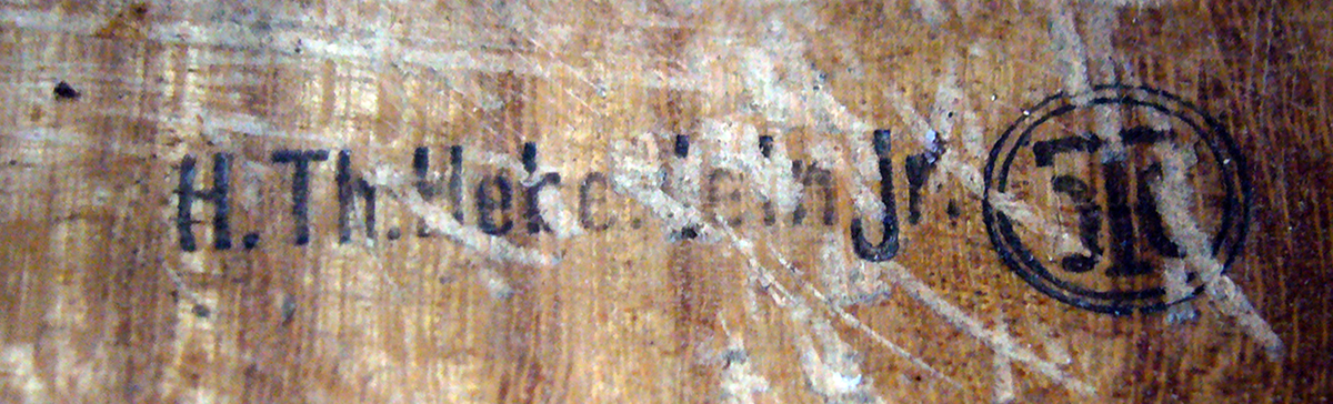 This violin appears to date from around 1890 and bears this maker's known brand inside, in the centre of the back. It reads H. Th. Heberlein Jr followed by the maker's crest (see photo) which makes it indisputable as originating from his workshop.