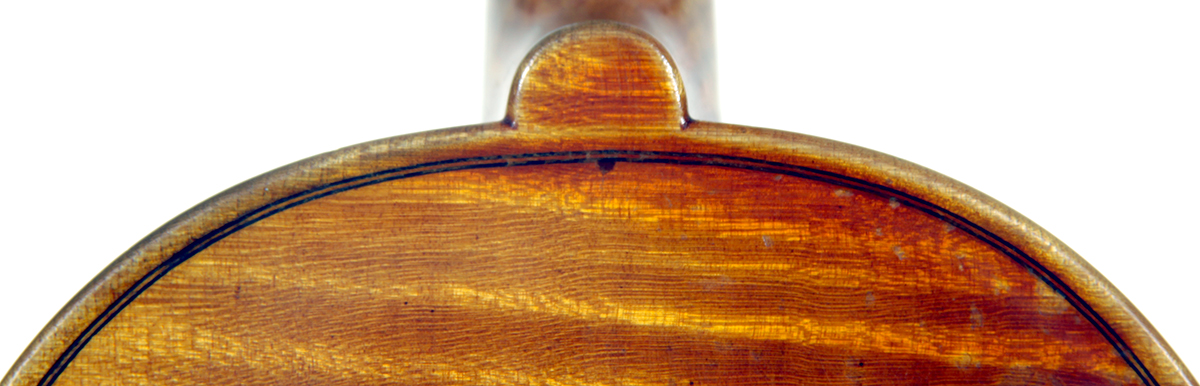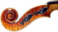 The attractive one-piece back, ribs, neck and scroll are made from the same piece of well-flamed maple with a distinct medium curl. The top is of superb tone-spruce. Workmanship throughout is refined and conforms to a very high standard. The scroll is particularly attractive - elegant and very well balanced. The golden amber varnish is slightly shaded and compliments the materials well.