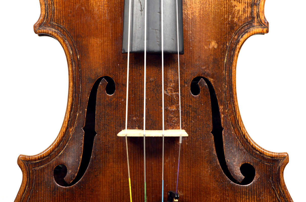 This violin is built on the Maggini pattern, which is slightly wider and longer than usual with fairly flat arching, double purfling and elongated sound holes. These copies were very popular among violin making workshops in France and Germany. The master, J. B. Vuillaume, had many Maggini copies made in his workshops as did the French firm of Jérôme Thibouville-Lamy and the workshop and studio of Justin Derazey, to which this instrument is attributed.