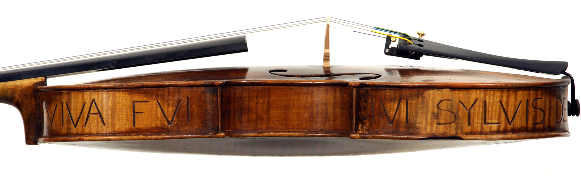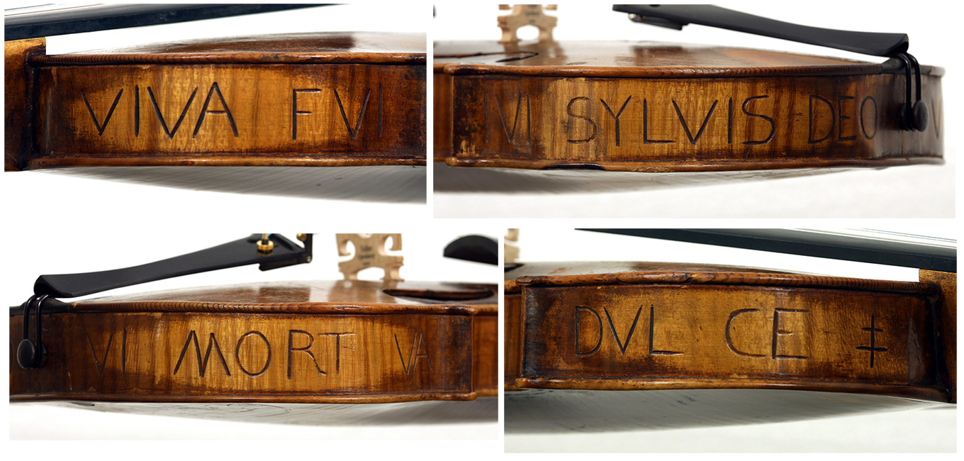 Interestingly the ribs bear an abbreviated version of the popular Latin 'Brescian Legend', which is basically an ode to the tree from which the violin was made. The contracted version, as on this violin, reads: 'VIVA FUI IVI SYLVIS DEO VI MORT VA DUL CE'. There are many renderings of this legend, but a very free translation of the original uncontracted version reads: