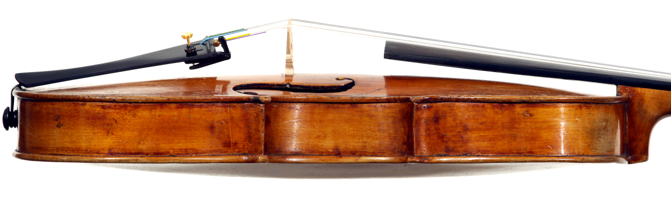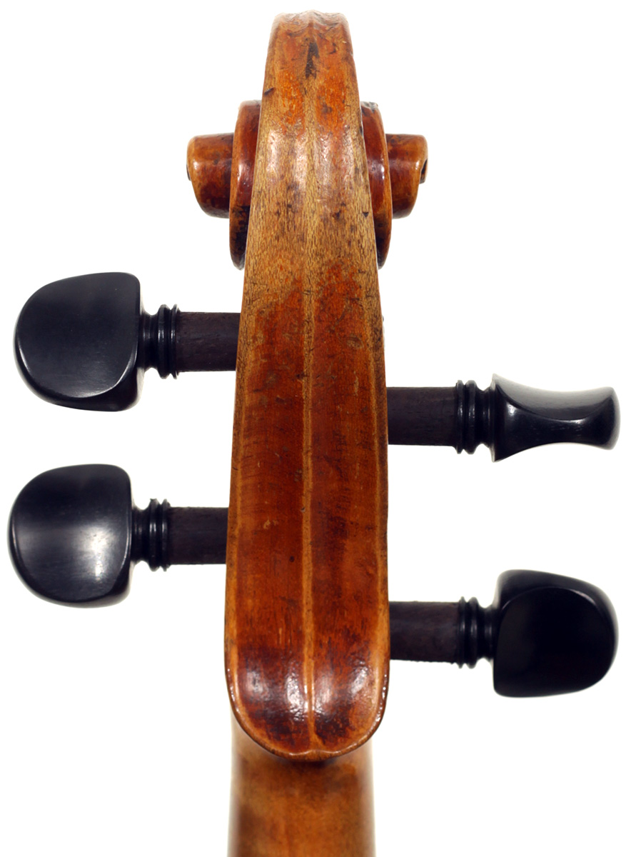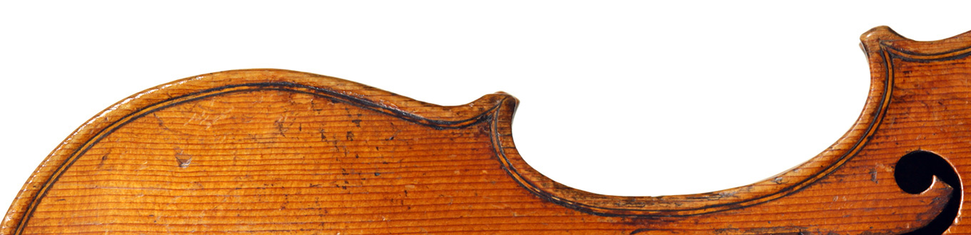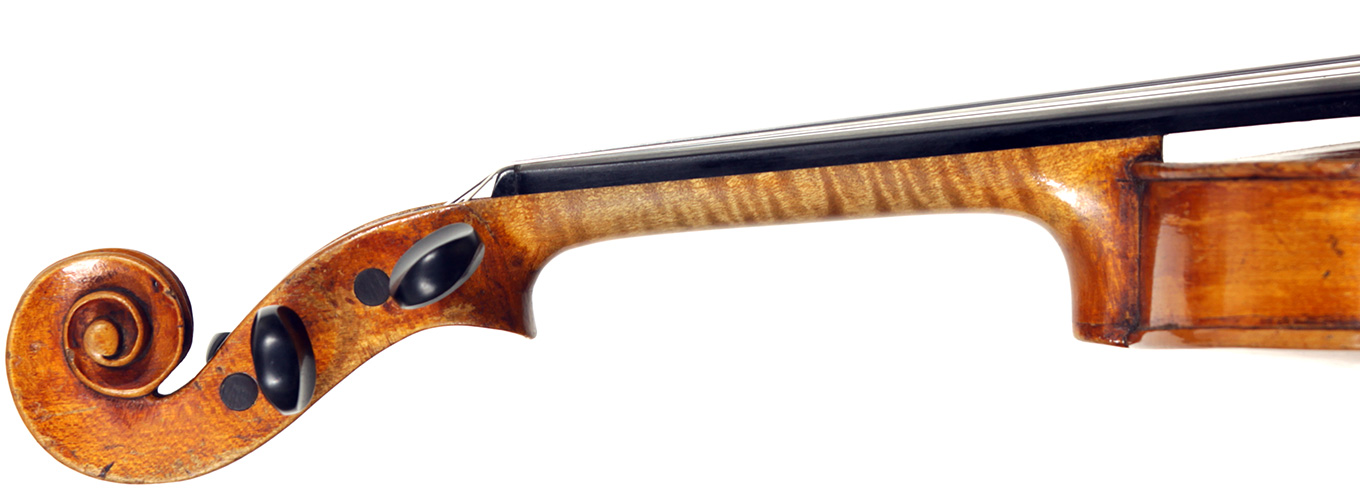 Much about this instrument intrigues: according to the foremost dendrochronologist, Peter Ratcliff, it was made after 1850, yet it has a perfectly executed neck graft (one of the best I've seen). This violin bears signs of much use, but is virtually in perfect structural condition. Furthermore, the central strip in the purfling appears to be of baleen (whalebone).
