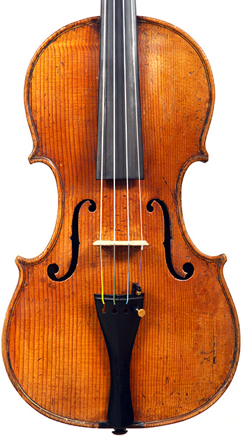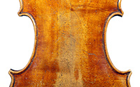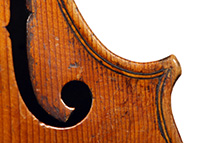 The light golden varnish on this violin, with a tinge of amber, is truly appealing. One is struck by the top, which is of unusually broadly grained tone spruce, crafted from a single piece of wood, with wide grain in the bass flank narrowing to the treble side. Furthermore, the back, ribs and scroll are of very plain maple, evidently slab-cut.