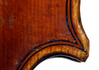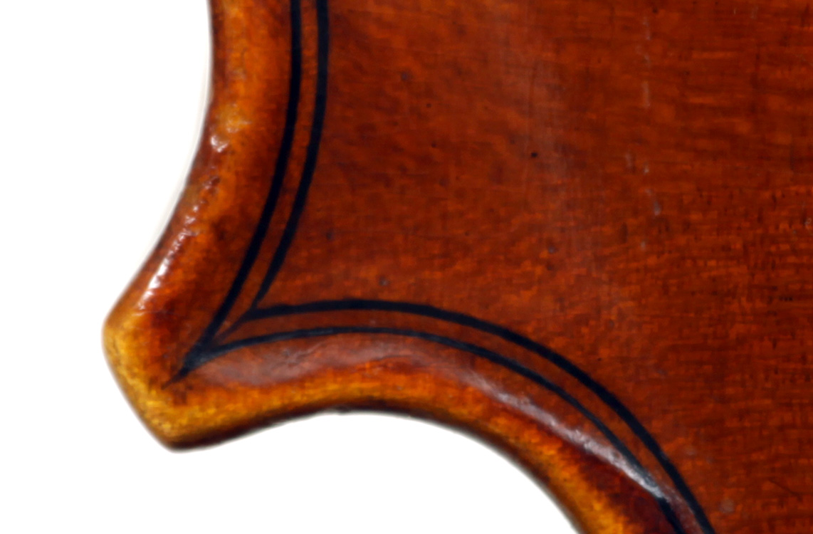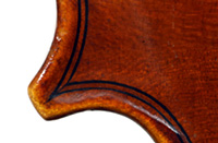 The one piece back, ribs, neck and scroll are of mildly flamed maple. The top is of excellent medium grain tone spruce. The oil-based varnish is a beautiful deep amber over a yellow ground. Purfling and cornerwork are impeccable.