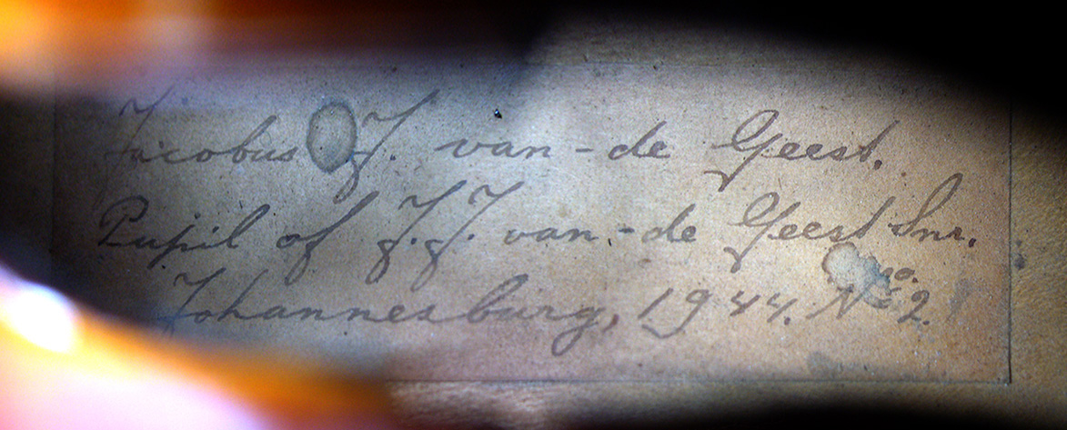 Jacobus Gerhardus Johannes (Jack) van De Geest (1924-1985) was one of the most important lute makers of the 20th century, if not the foremost. This violin was made during his apprenticeship under his father, the important Dutch violinmaker, who himself was studio foreman for George Hart & Sons in London for 18 years before moving to South Africa in 1939.